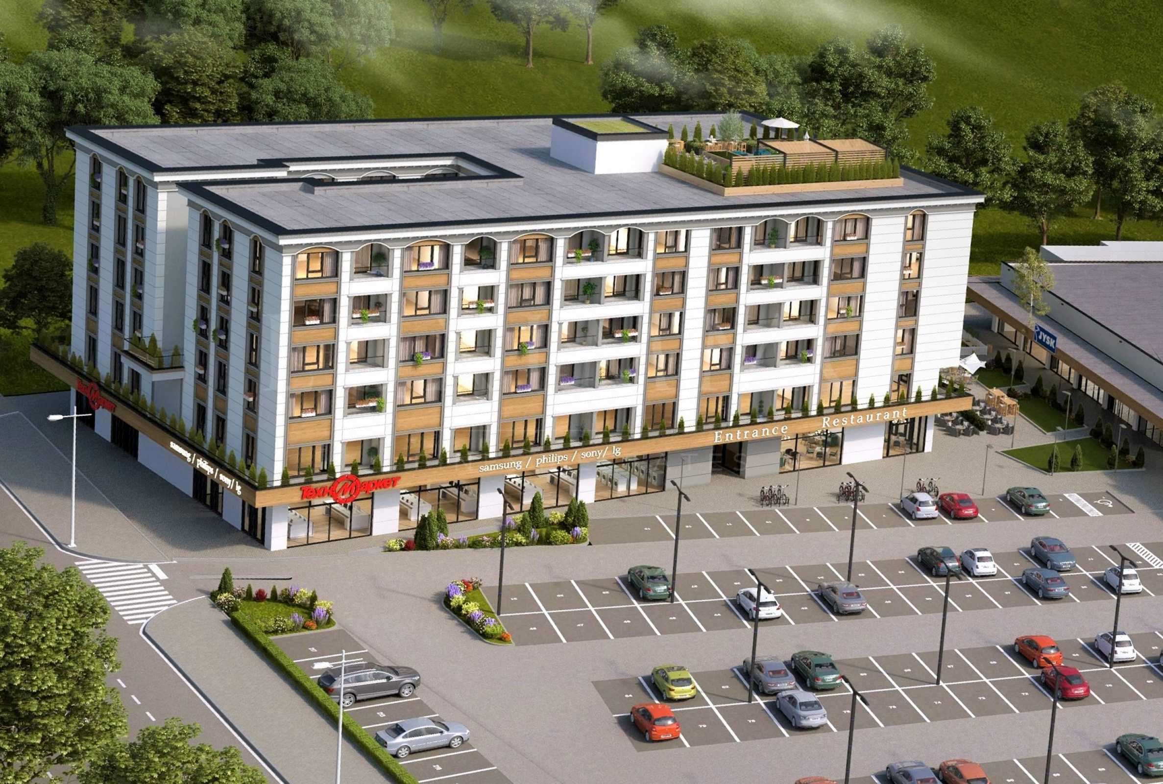 Разпределена на 6 етажа, сградата е със смесено предназначение. На ниво партер са разположени търговски обекти - магазини и ресторант, на 2-ри има налични 11 офиси, а от 3-ти до 6-и етаж е жилищната част с общо 60 апартамента. Има избор от двустайни и тристайни с функционални и просторни помещения, позволяващи обединение в по-големи апартаменти, а паркирането е решено с паркоместа и гаражи.