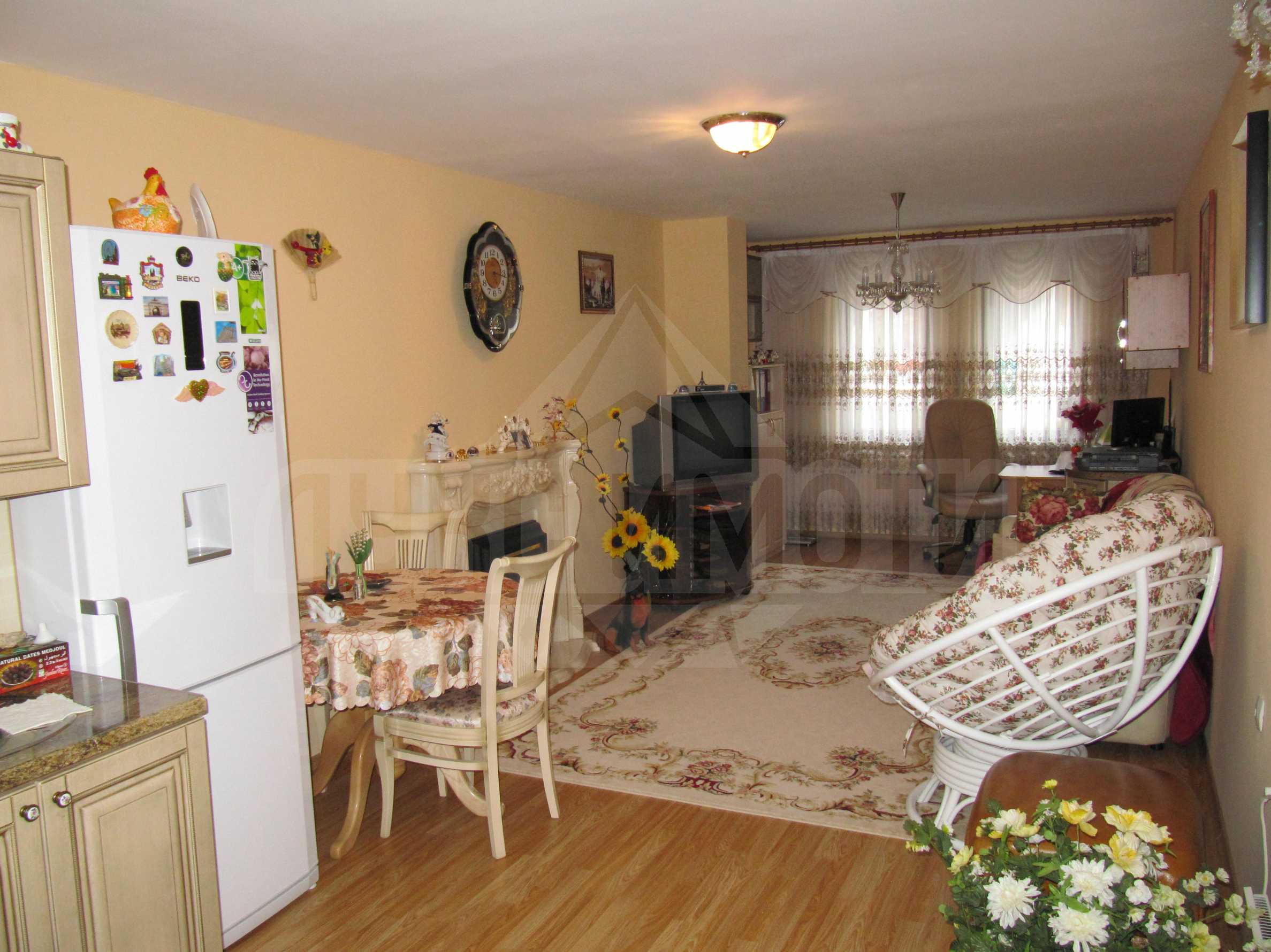 Жилищната площ се разпределя между хол с кухненски бокс, спалня с остъклен балкон и баня с тоалетна. Подовите настилки са с плочки в кухнята и ламинат в останалите помещения. Апартаментът е завършен с ПВЦ дограми на прозорците и външни ролетни щори, както и душ кабина в банята. Може да обзаведете имота по ваш вкус. Жилището е окабелено за телефон, кабелна телевизия, интернет, а сградата разполага с портиер и асансьор.