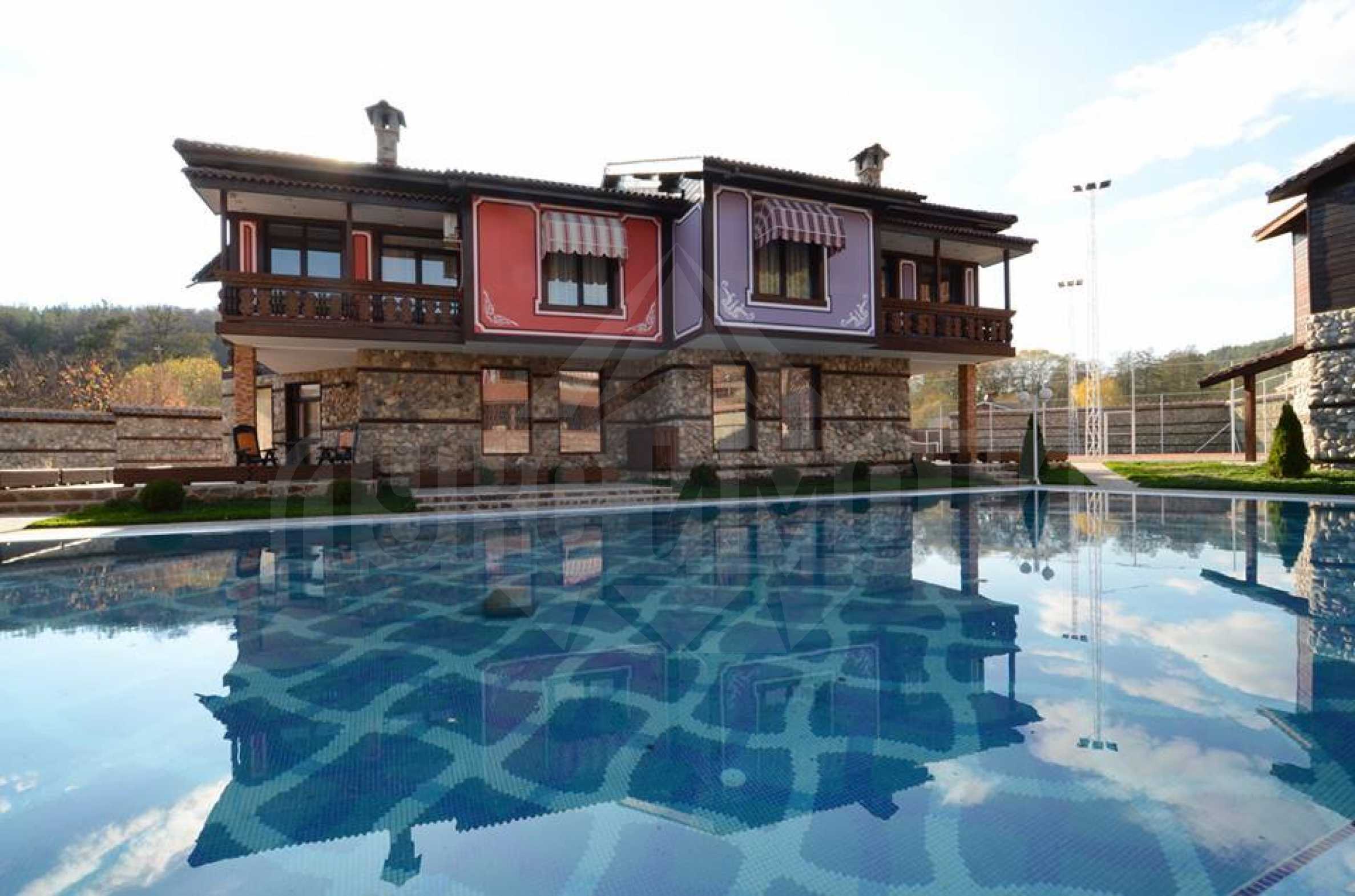 Освен основната сграда, в комплекса има още 5 самостоятелни мезонетни постройки, едната от които е с РЗП 245 кв.м. Тя притежава разкошна спалня и хол с панорама към басейна, трапезария, кухня и още две спални, подходящи за семейства с деца. Останалите 4 сгради в комплекса са с РЗП 202 кв.м. Всяка от тях разполага с просторен хол с прекрасен изглед към басейна, камина и оборудвани кухни и трапезарии. Вътрешна дървена стълба води до уютните спални на втория етаж, като всяка е със собствен санитарен възел и тераса.