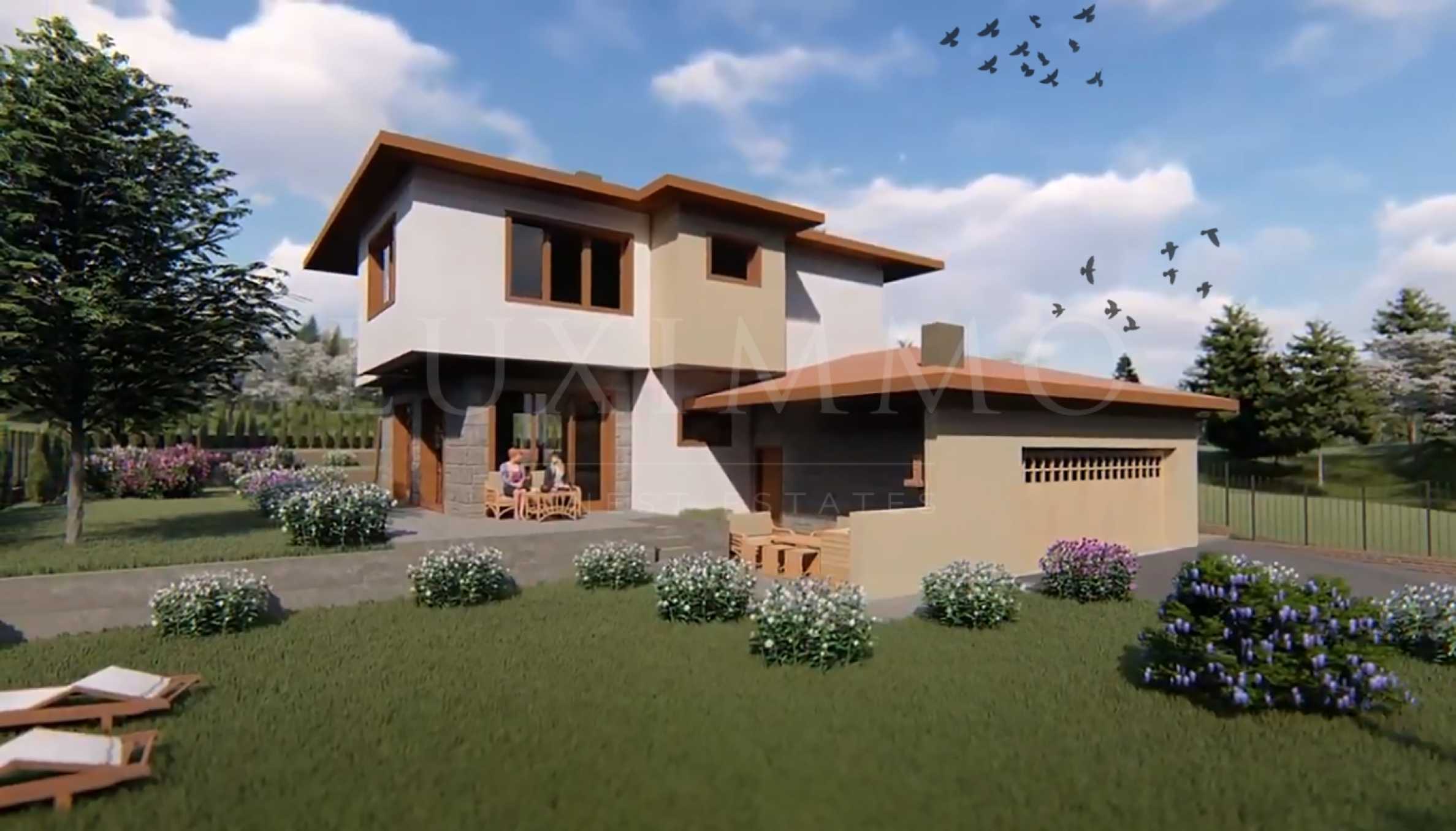 Обособена е и зона за отдих и свободно време - веранда в задната част на къщата и място за барбекю. Предвиден е гараж за 2 автомобила с топла връзка до къщата, както и достъп към барбекюто.
