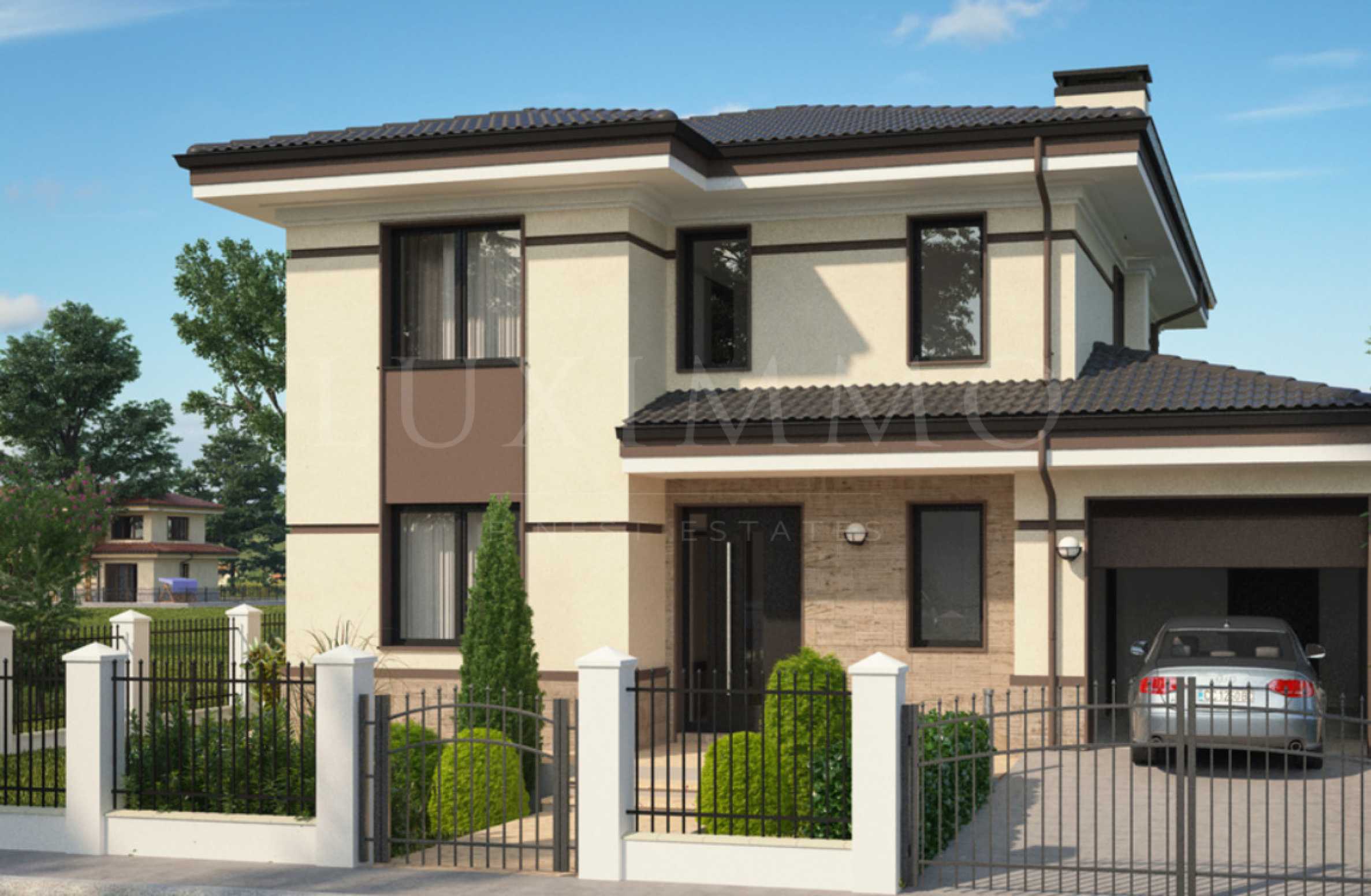 Представяме Ви нова самостоятелна къща в проект, в с. Първенец, до Пловдив. Къщата е на два етажа и разполага с гараж и собствен двор.