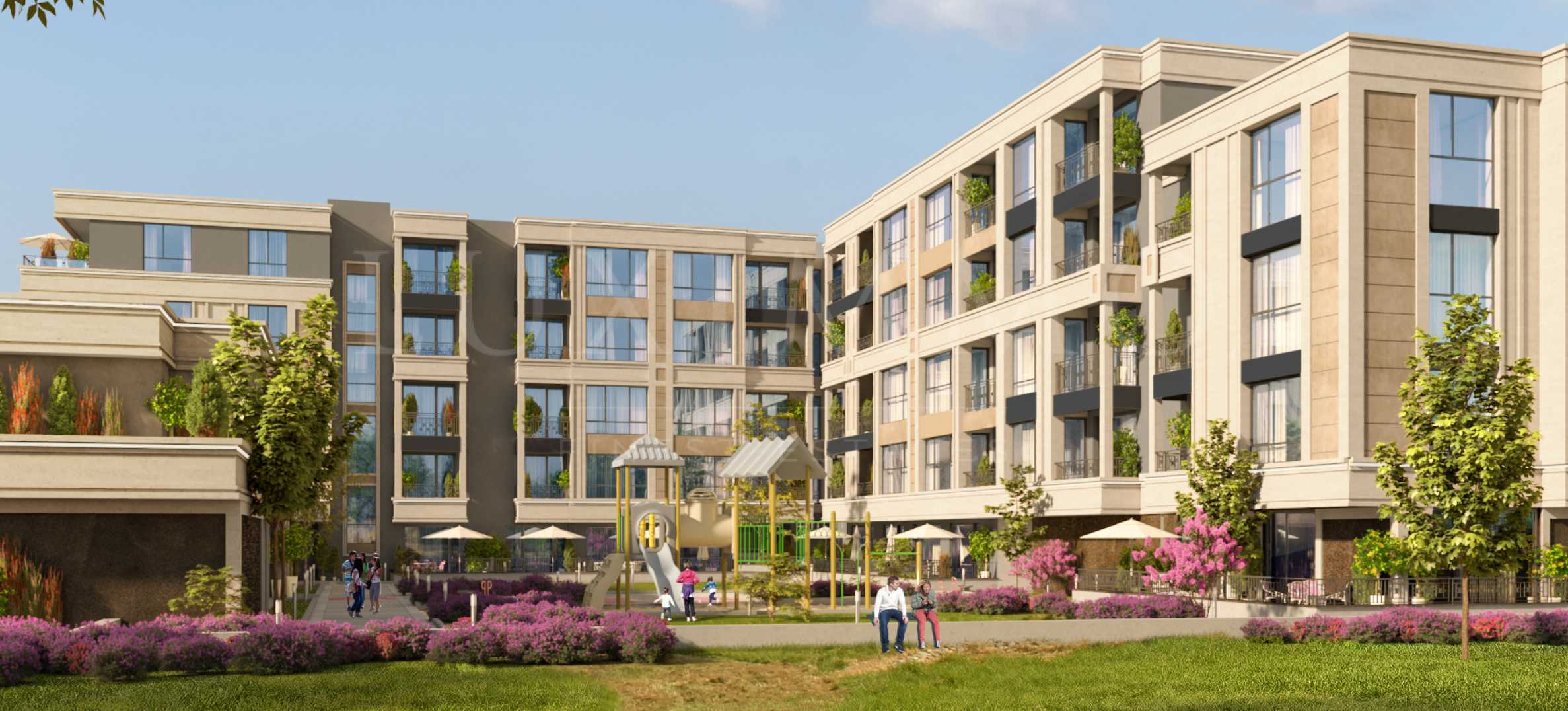 Жилищните секции са ниски с по 4 до 6 апартамента на етаж, на партерните нива апартаментите са със собствен двор/ веранда.