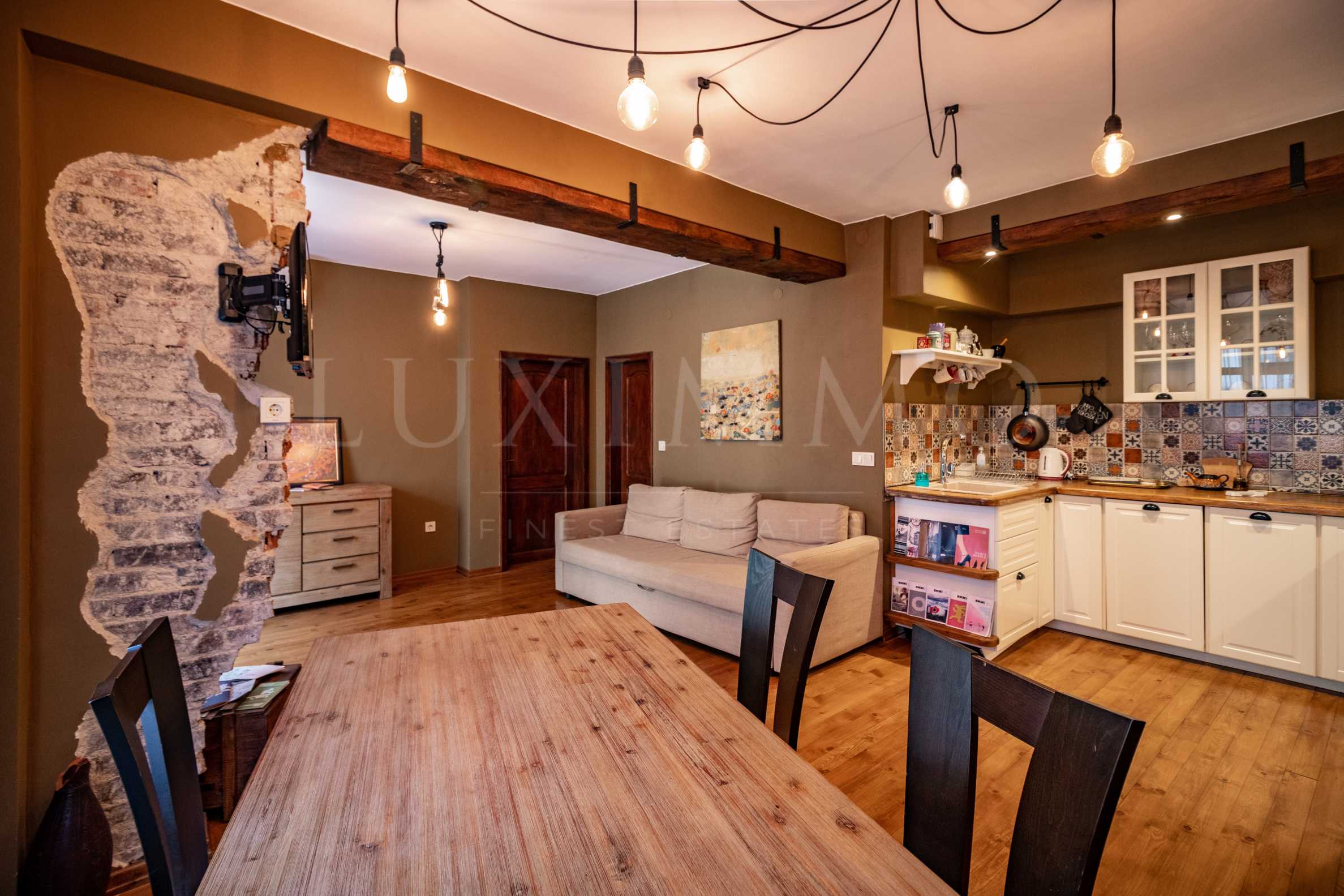 Имотът с площ от 55 кв.м е обзаведен и ремонтиран с много фантазия и внимание към детайла, за да създаде уют и спокойствие на обитателите си. Разположен е на партерния етаж на малка кооперация и има излаз към добре поддържан двор.