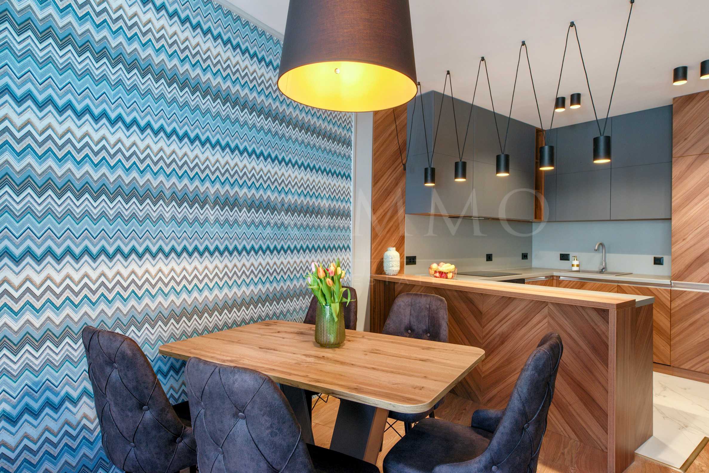 Жилището е кокетно обзаведено с поръчкови мебели от висок клас. Интериорните дизайнери са заложили на функционалността и удобството. Още с входната врата Ви посреща уютно антре с удобни мебели и огледални гардеробни врати. Дневната и кухнята са решени в сиво и кафяво. Обособено е място за хранене, както и кът за Working space (работно място). Спалнята е с френски прозорци, които създават прекрасна атмосфера. За повече удобство и комфорт е обособена и красива малка гардеробна.