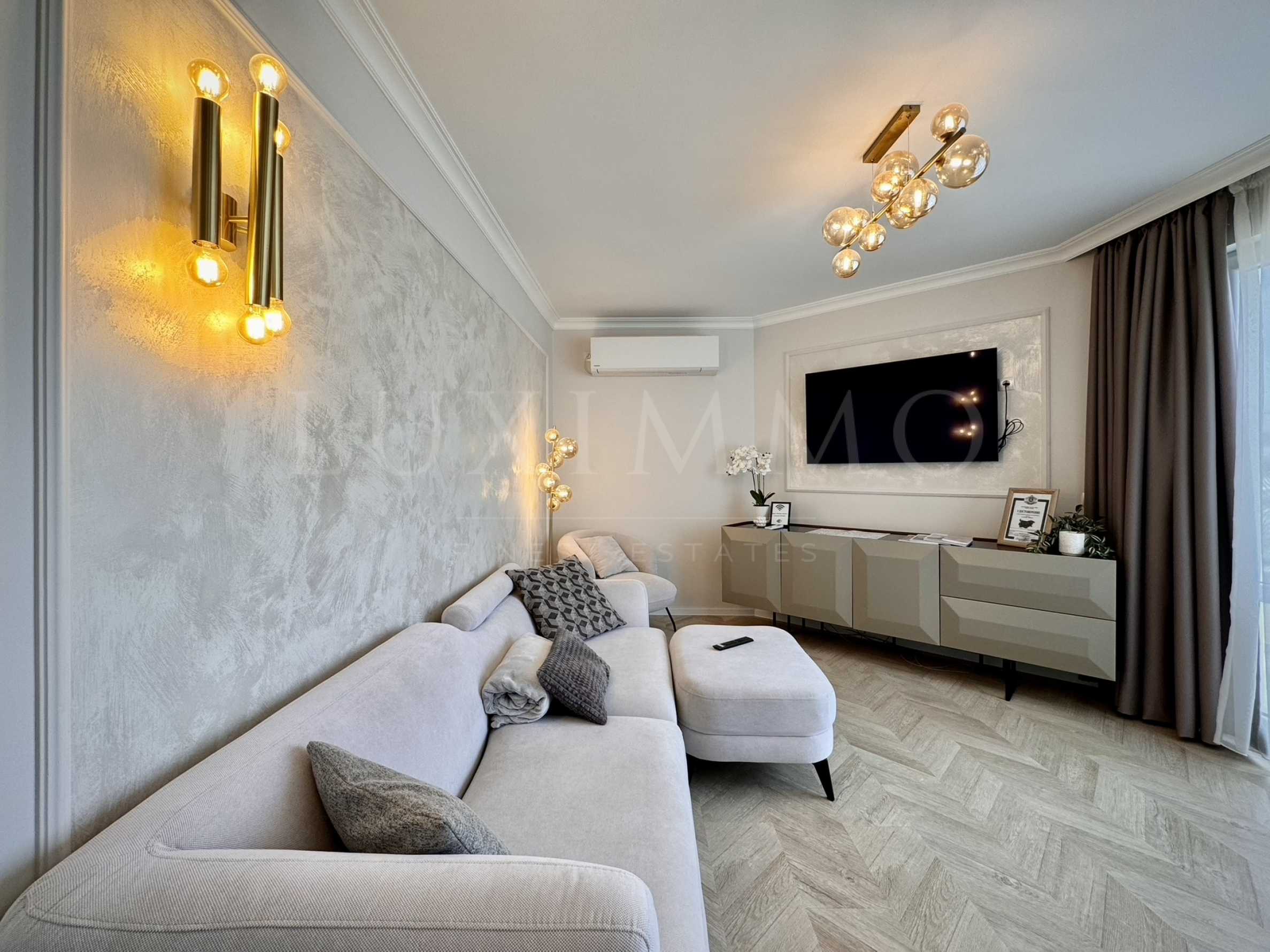 В дневната има удобен и функционален диван с фотьойл и трапезна маса с капацитет за 4 човека. Спалнята и обзавеждането в нея са изцяло изработени по поръчка. Гардеробите са функционални и предоставят много място за съхранение. В банята са използвани испански гранитогрес и има голямо огледало и удобен контакт.
