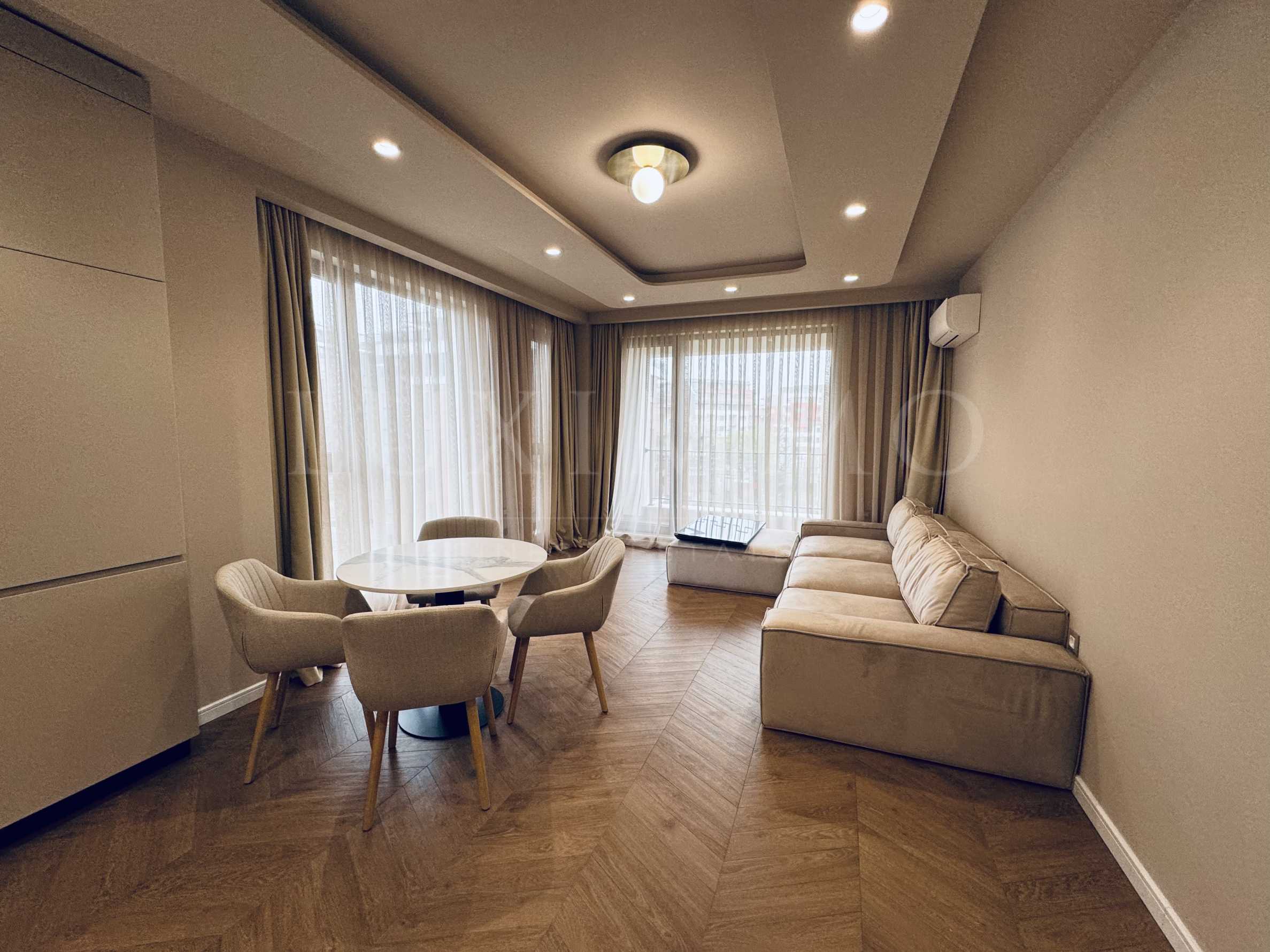Апартаментът е напълно обзаведен и оборудван, продава се с налични, модерни мебели и нови ел. уреди от най-висок клас, в гаранция. Отоплението и охлаждането са предвидени с климатици в двете стаи.
