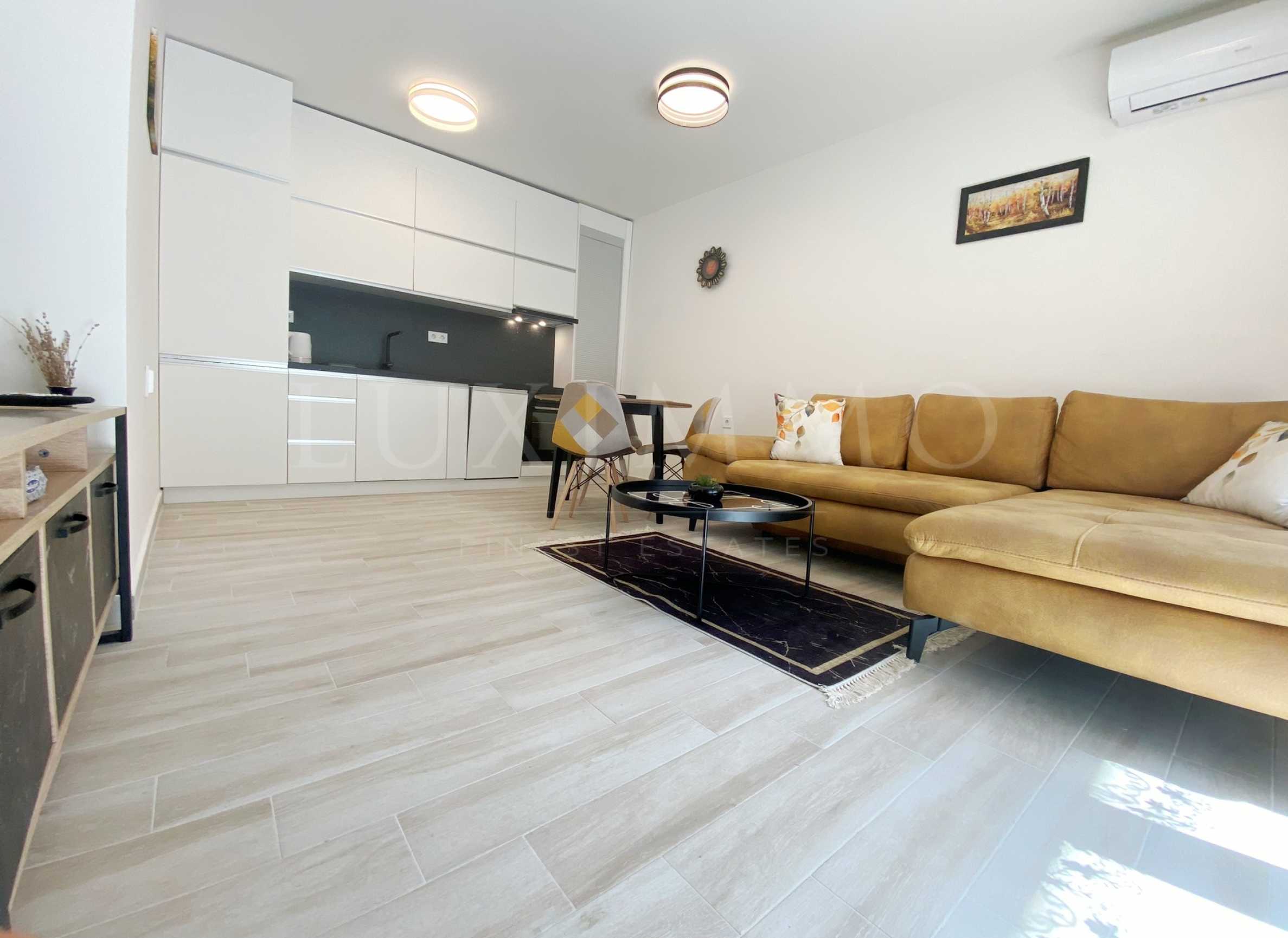 Апартаментът е напълно обзаведен и оборудван с модерни мебели и ел. уреди с висок енергиен клас, в гаранция. Отоплението и охлаждането са решени с инверторни климатици във всяка стая. Разполага с външни ролетни щори, както и окабеляване за оптичен интернет.
