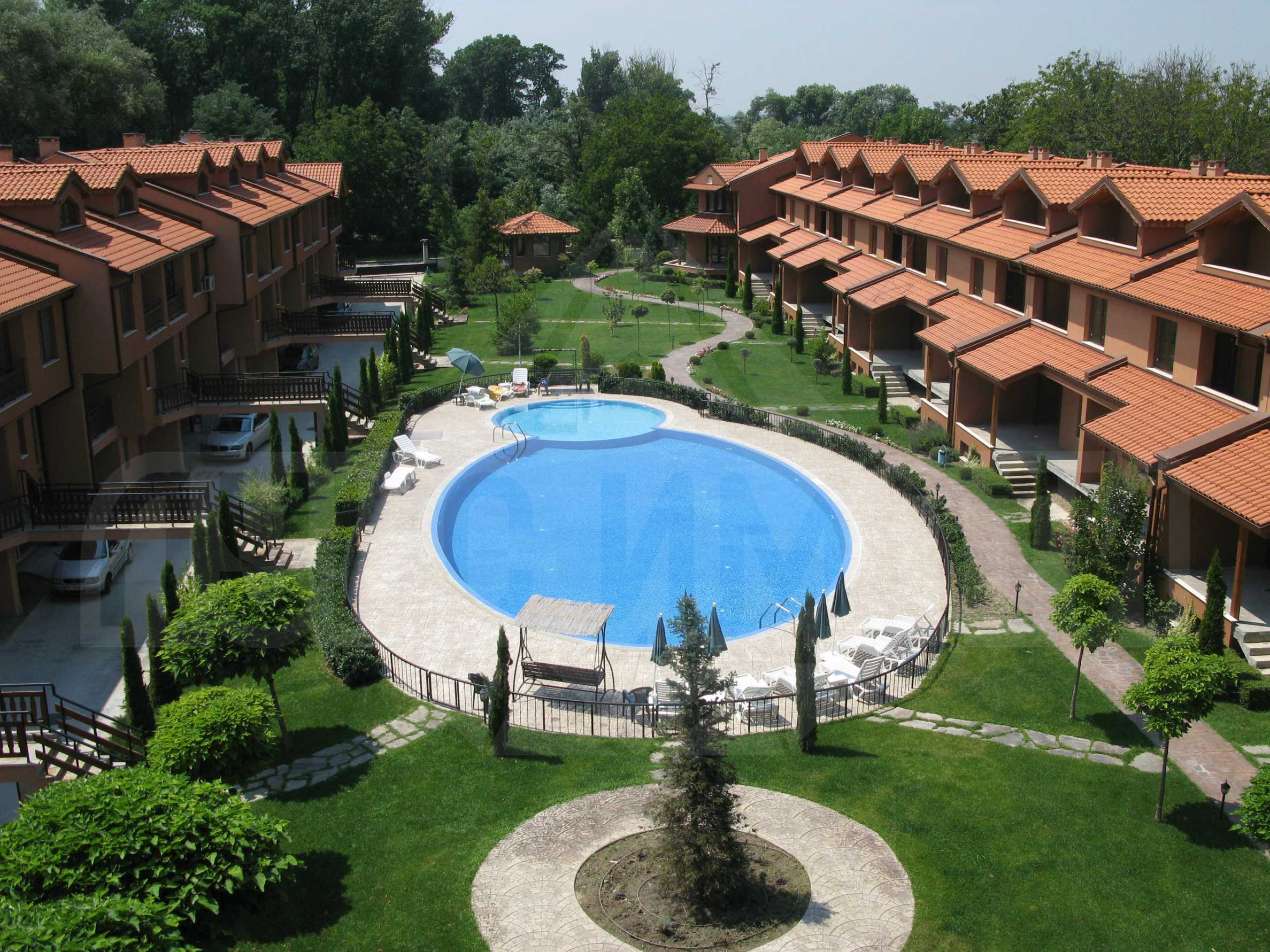 Апартаментите, описани в настоящата оферта, се предлагат в състояние на шпакловка и замазка. От терасите и прозорците на апартаментите и на 20-те редови къщи в комплекса се открива прекрасна гледка към вътрешния добре озеленен и поддържан двор с басейн за възрастни – достатъчно голям, за да задоволи нуждите на всички живущи от спорт и развлечения. Помислено е и за малките жители на комплекса, като за тях е изградена детска секция към големия басейн, с безопасна дълбочина. Басейнът е обезопасен с декоративна ограда със заключващи се вратички, за предпазване от неволно попадане в близост до водните площи.