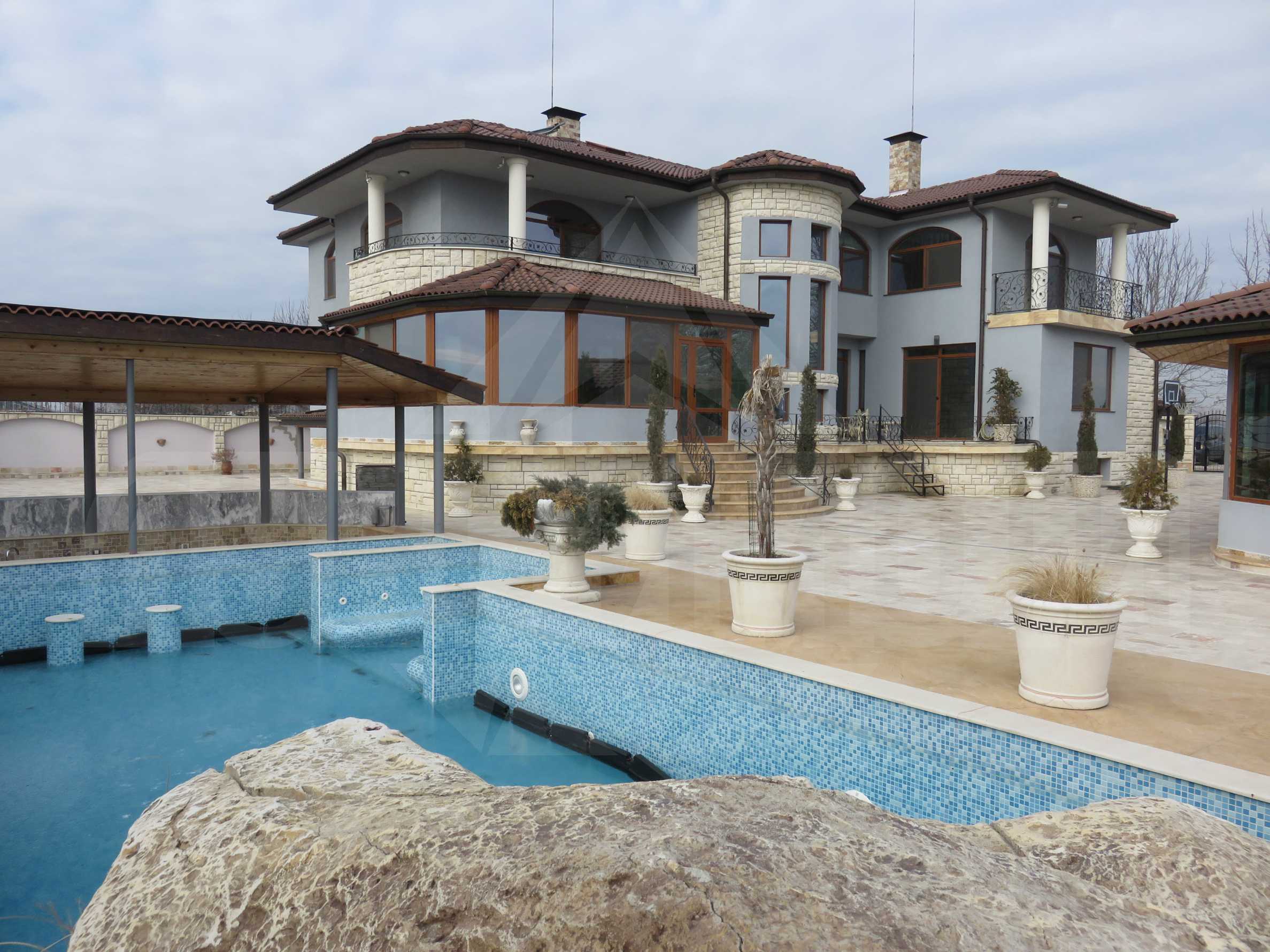 Басейнът е с размери 12х4.5 м и е изцяло покрит с порцеланови плочки. Има и скалист водоскок, както и свое собствено машинно помещение. Оборудван е с инфрачервена лампа, джакузи и има отоплителна слънчева инсталация, която го прави използваем поне 5-6 месеца от годината. Разполага с уред за третиране на водата с йонизация, спомагащ за минимализиране употребата на химикали.
