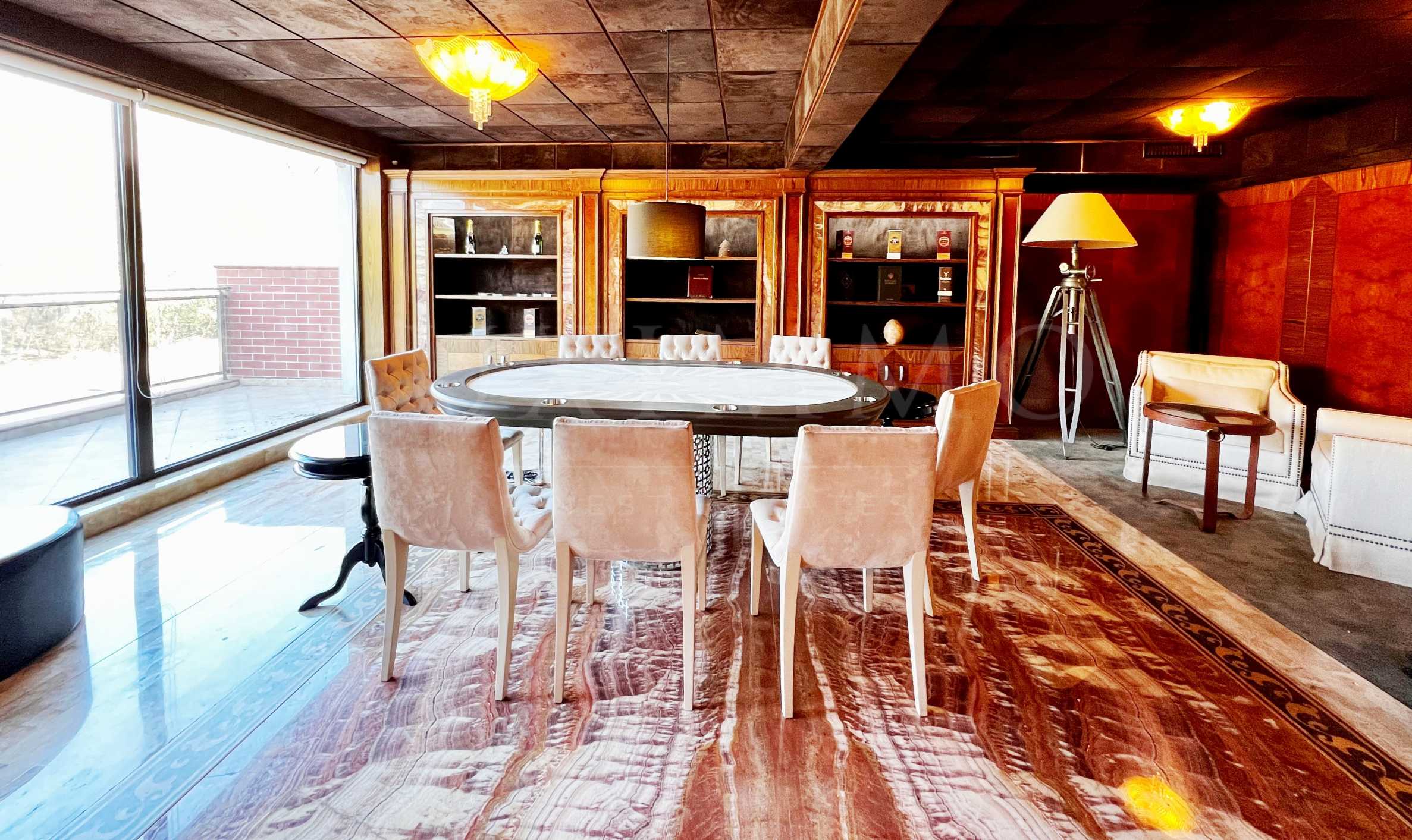 Помещението е изградено с луксозни материали. Разполага с подови настилки от камък, стени в комбинация от камък и облицовка от естествен велур, окачени тавани.