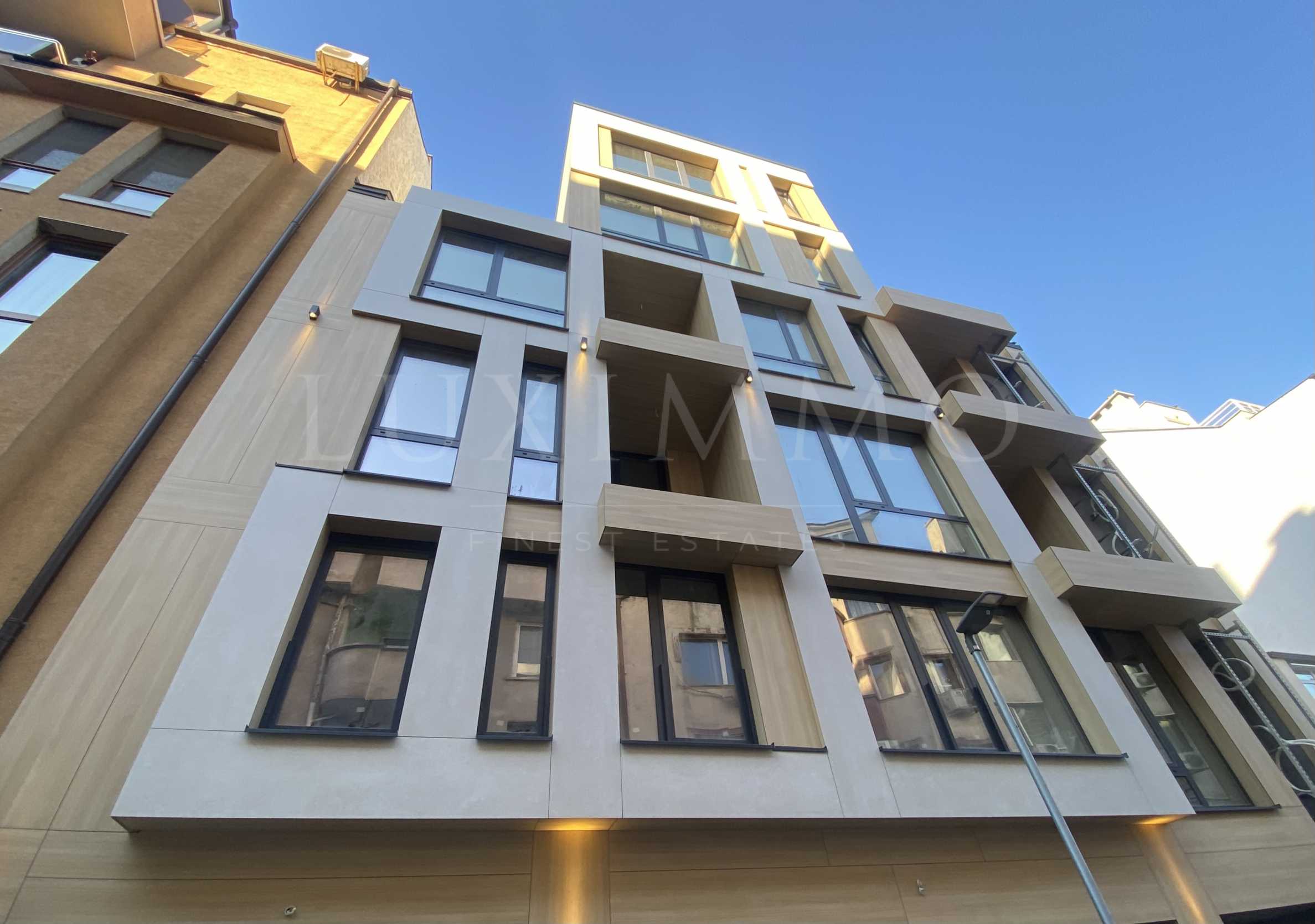 Решена на 6 нива, сградата притежава елегантна архитектурна визия с фасада от стъкло и естествен камък. Безкомпромисно качество в строителството, със заложени материали и техники от най-висок клас. Проектирани са общо 9 апартамента, по два на всеки етаж и един просторен пентхаус на последно ниво. Паркирането е решено с 9 гаража и паркоместа на ниво партер.
