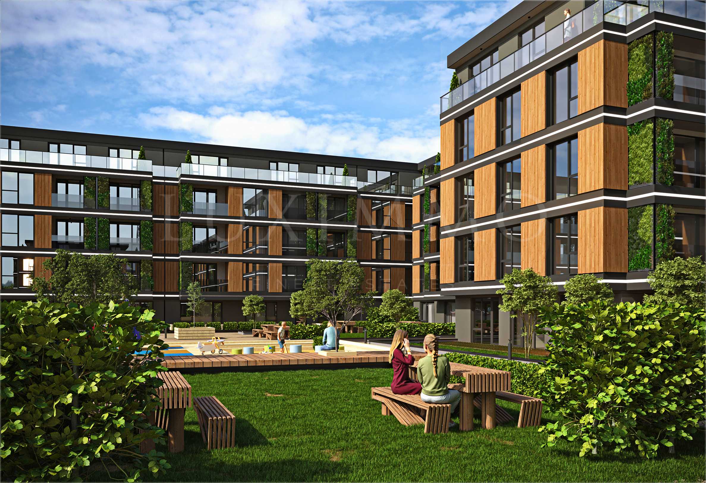 Трите секции на комплекса обграждат красива градина с площ 3 000 кв.м, която оформя вътрешното пространство. Освен зеленина, ще има фонтани, пешеходни алеи, зони за релакс и детски площадки.