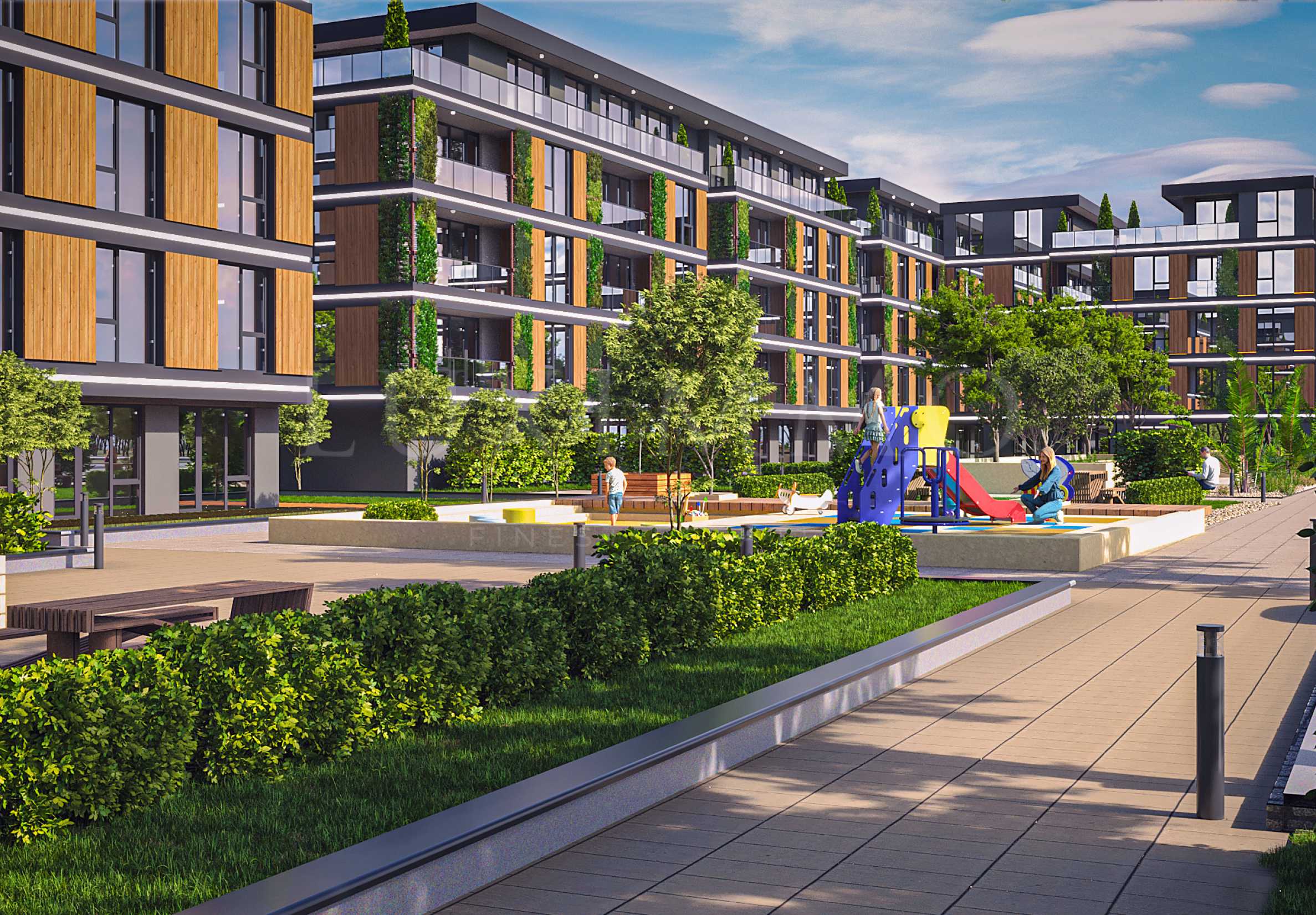 Трите секции на комплекса обграждат красива градина с площ 3 000 кв.м, която оформя вътрешното пространство. Освен зеленина, ще има фонтани, пешеходни алеи, зони за релакс и детски площадки.