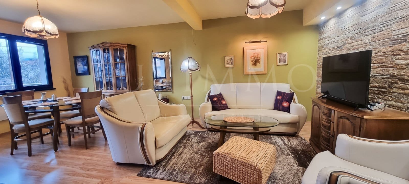Къщата се продава с цялото налично обзавеждане, видно на снимковия материал - поръчкова кухня с на практика нови висок клас електроуреди и масивни мебели от естествен дървен материал в хола и трите спални.