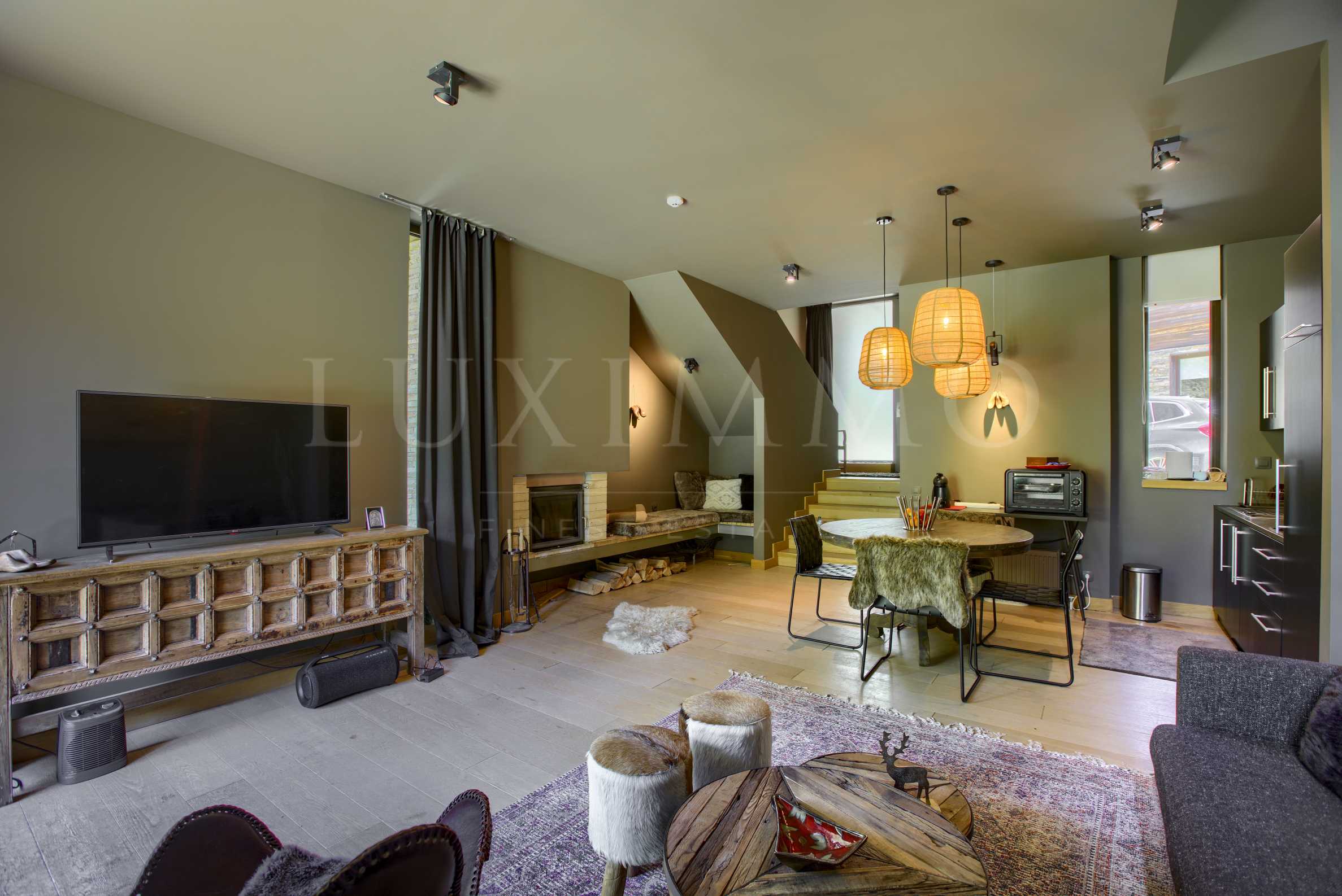 Вилата е построена през 2010 г., а е мебелирана и се използва активно от 2015 г. Материалите и довършителните работи са на най-високо ниво. Сегашният собственик е закупил имота в базов вътрешен вид, след което с известен архитект от Израел е изготвил специален интериорен проект, по който вилата е завършена и обзаведена. Мебелите са луксозни, внос от Италия и Холандия, само от естествени материали, в комбинация от дърво и кожа. Стилът е модерен планински, изцяло съпоставим с най-добрите планински къщи тип "chalet" в алпийските курорти на Западна Европа. Бялата и черната техника са също от висок клас. Всички мебели, техника и аксесоари (с изключение на някои вещи с емоционална стойност за собственика и предмети на изкуството) са включени в цената, като имотът се продава напълно във вида си, представен тук. Цялостното интериорно завършване на вилата в комбинация с внимателно подбраните мебели, аксесоари и елементи от вътрешното пространство правят имота не само модерен, но също и изключително уютен.