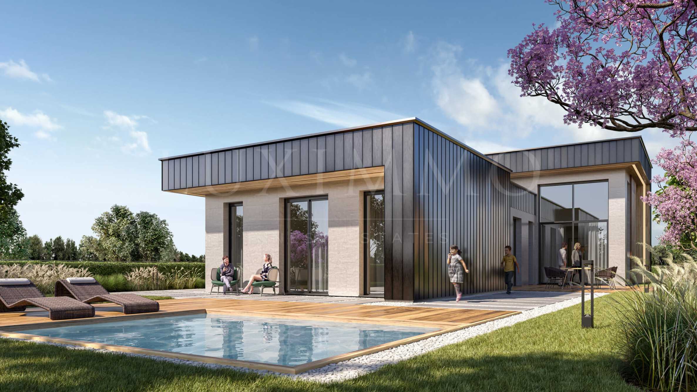 Имотът е част от комплекс с 13 еднофамилни къщи разпределени в два типа - едноетажни къщи с площ 230 кв.м и двуетажни къщи с площ 351 кв.м, всяка разположена в самостоятелен терен от около 900 кв.м, който е включен в цената.