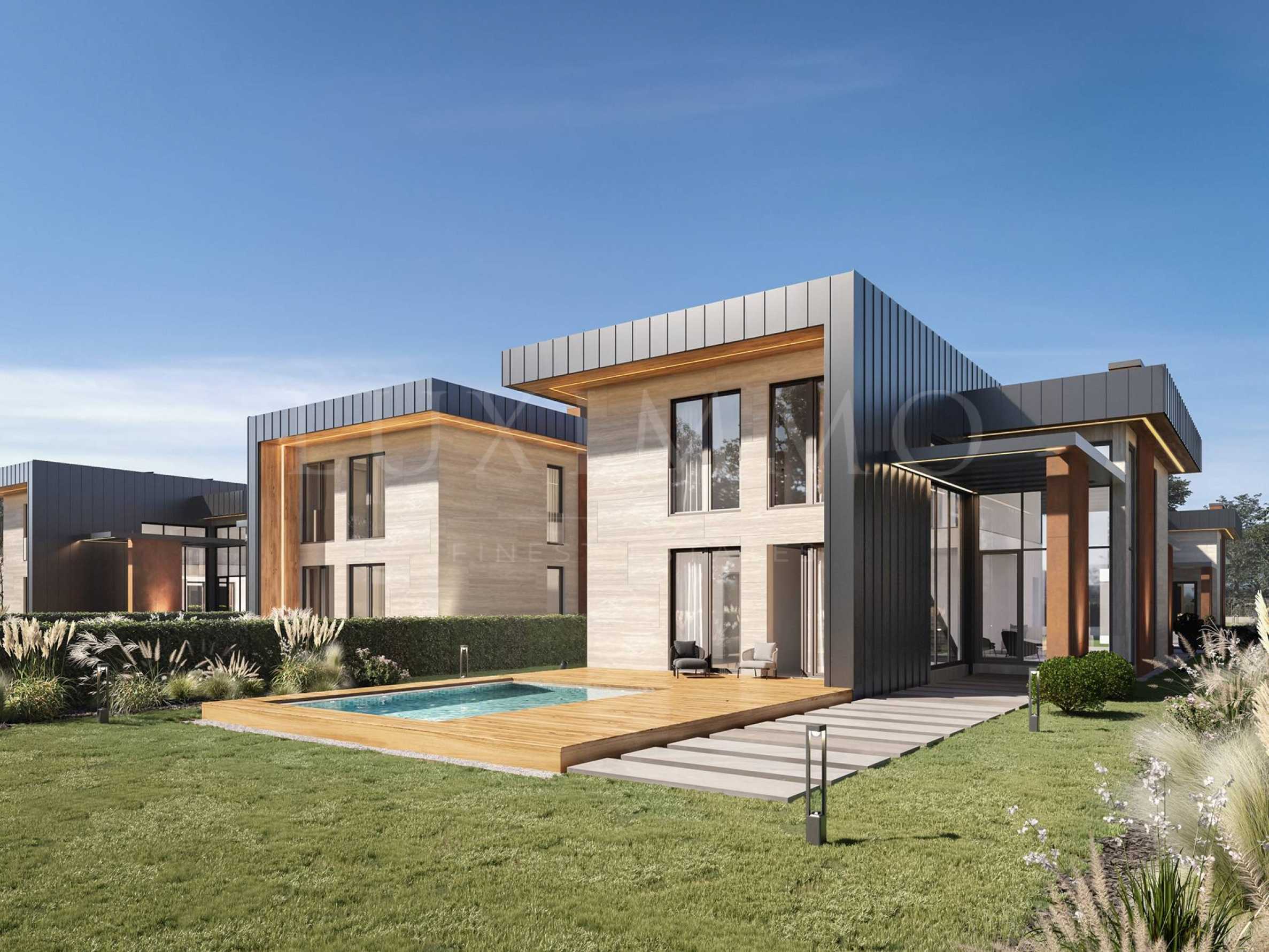 Имотът е част от комплекс с 13 еднофамилни къщи разпределени в два типа - едноетажни къщи с площ 230 кв.м и двуетажни къщи с площ 351 кв.м, всяка разположена в самостоятелен терен от около 900 кв.м, който е включен в цената.