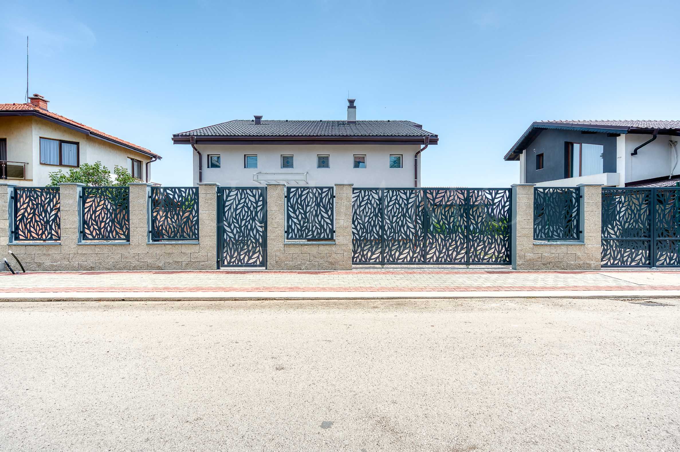 Дворът е 400 кв.м, равен и озеленен, ограден с масивна комбинация от камък и стоманени пана. Има пешеходна и гаражна врата с дистанционно управление, както и обособено място за паркиране.