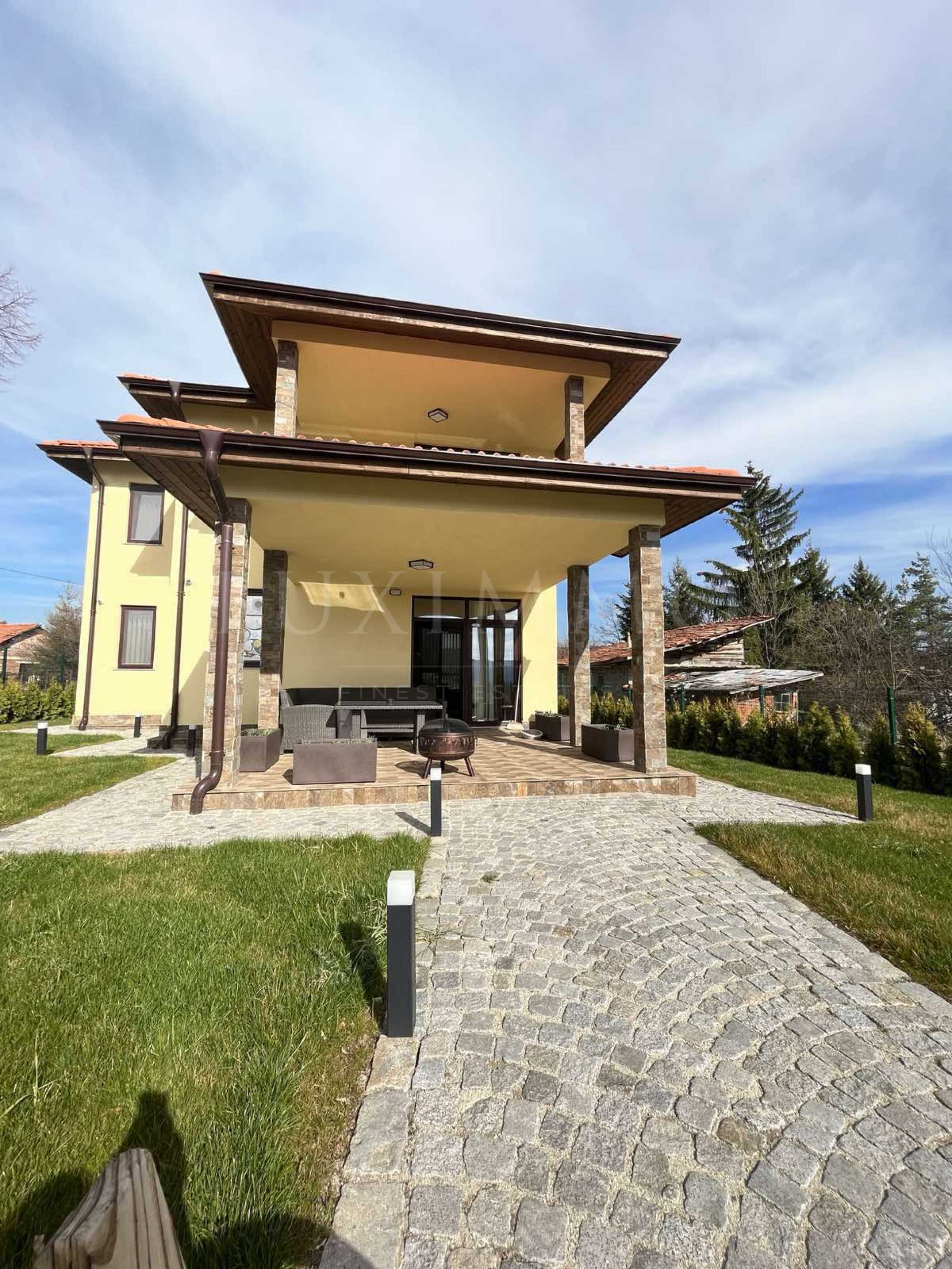 Имотът е разположен в красиво аранжиран и поддържан парцел с площ от 1 000 кв.м и красива гледка към планината. Жилището е с обща площ от 229, 56 кв.м, така разпределени, че да създават максимално удобство и комфорт. Къщата има следното разпределение: