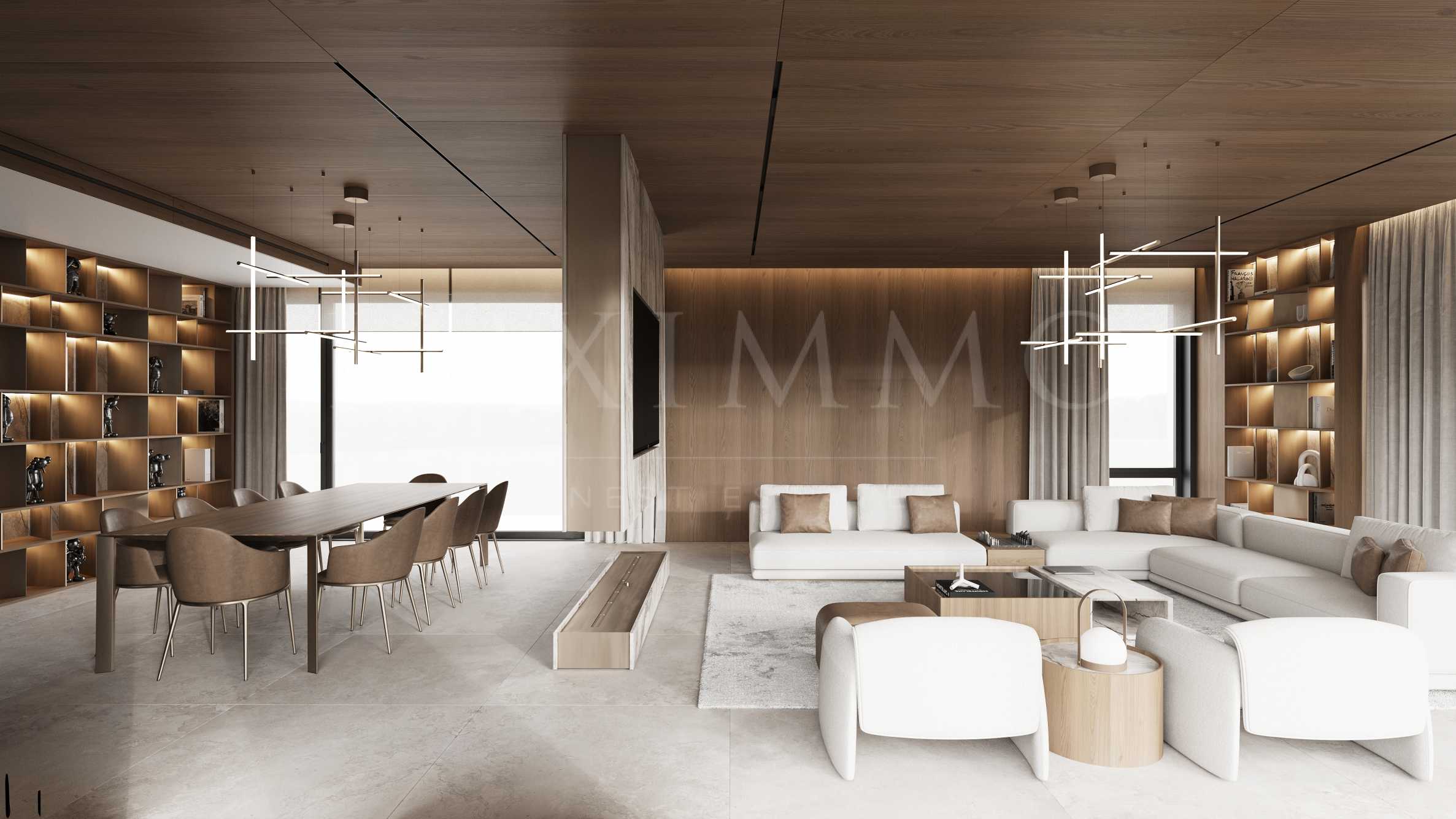 • Ниво 2: мастър спалня (28.47 м2) с голям дрешник (18.48 м2) и баня с тоалетна (15.91 м2) и сауна, втора спалня с дрешник и баня с тоалетна, трета спалня с баня с тоалетна и мокро помещение.