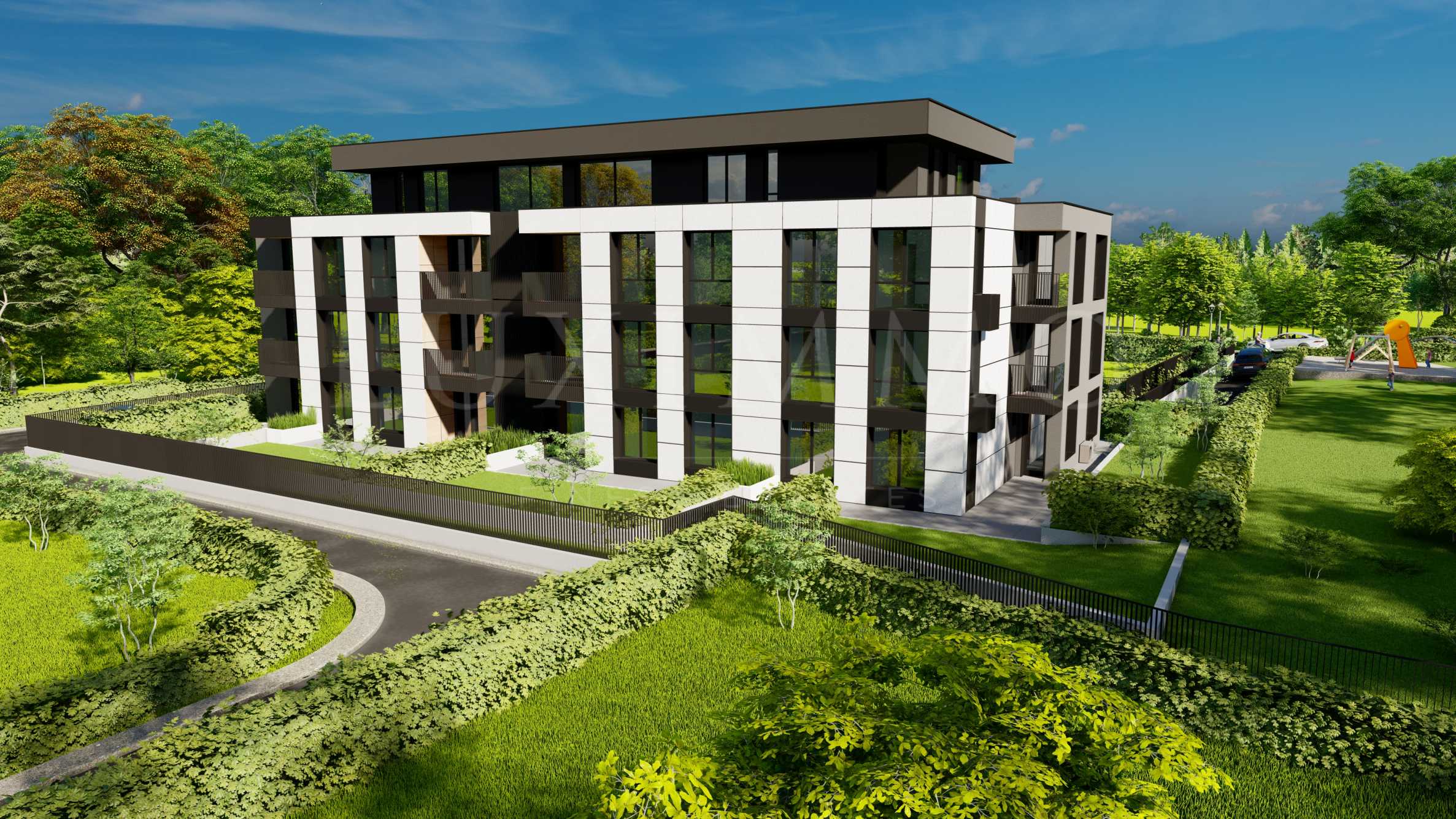 Архитектурната визия е модерна, с фасадно оформление, комбинация от полимерна мазилка и естествен камък. Общите части ще бъдат луксозно изпълнени и оборудвани с гранит, дървена ламперия и луксозен хидравличен асансьор. Предвидени са богато озеленени площи, паркова среда с детски кът, както и фасадно LED осветление и декоративно градинско осветление, което да очертае парцела и зелените площи.