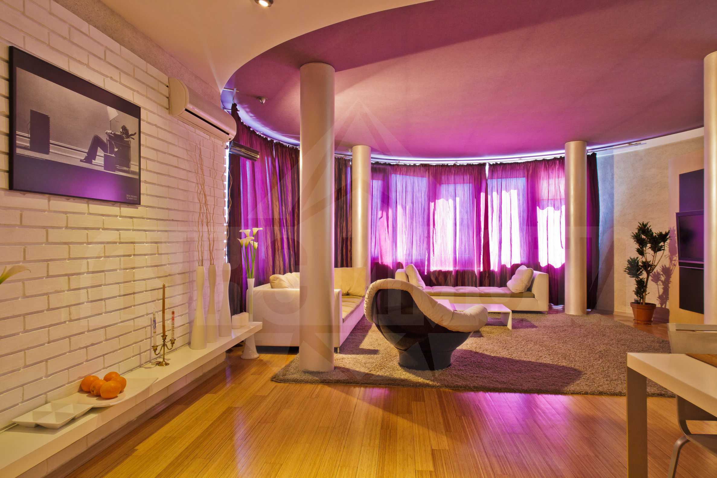 Апартаментът е на последните два етажа- шести и седми. Изложението е юг/изток- с красив изглед към планина Витоша и зеленината в района. Предлага се с висок клас довършителни работи: