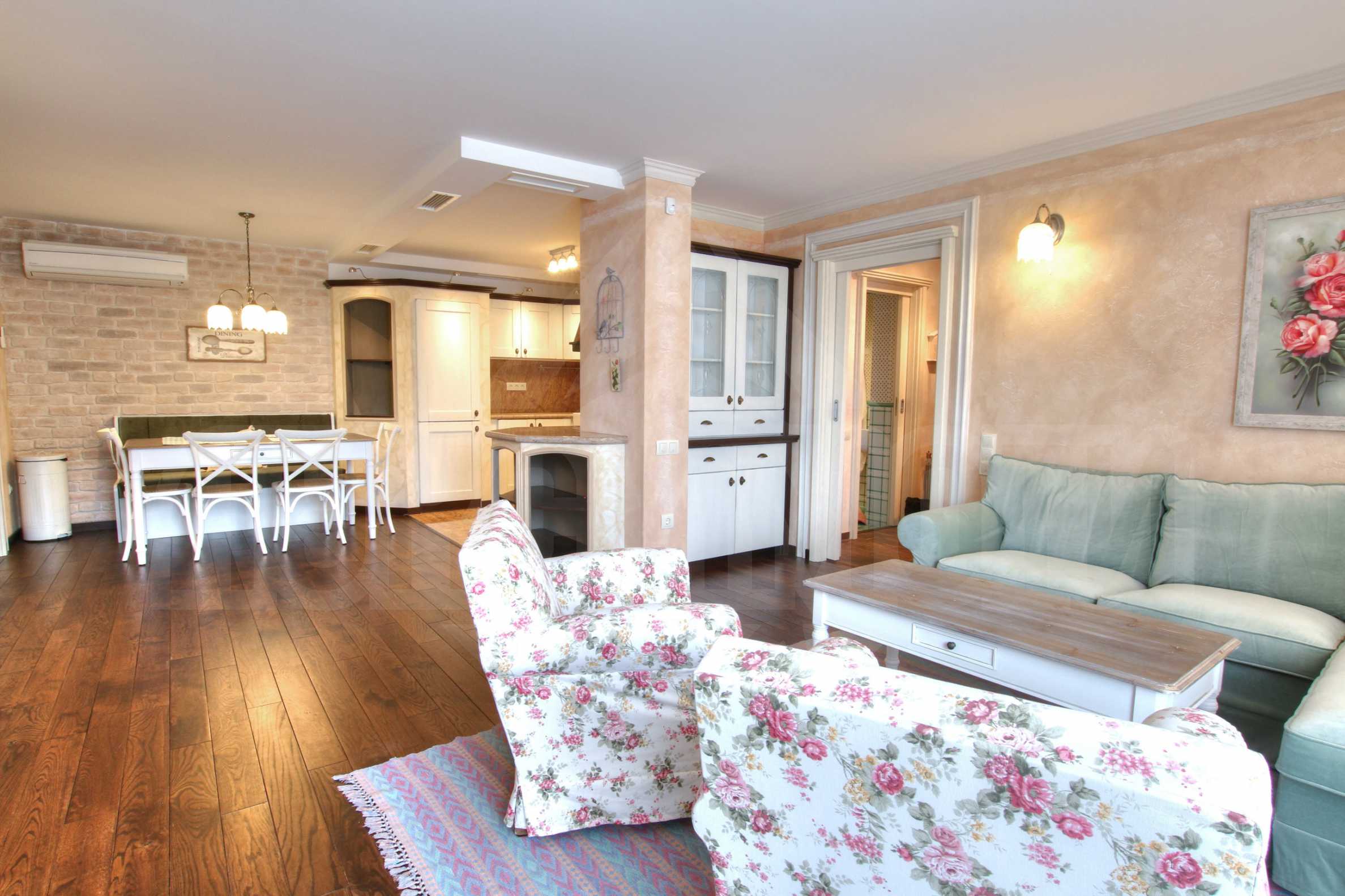 Жилището е обзаведено по дизайнерски проект на собственика с качествени мебели в стил "британски шик". Отдава се във вида от снимките.