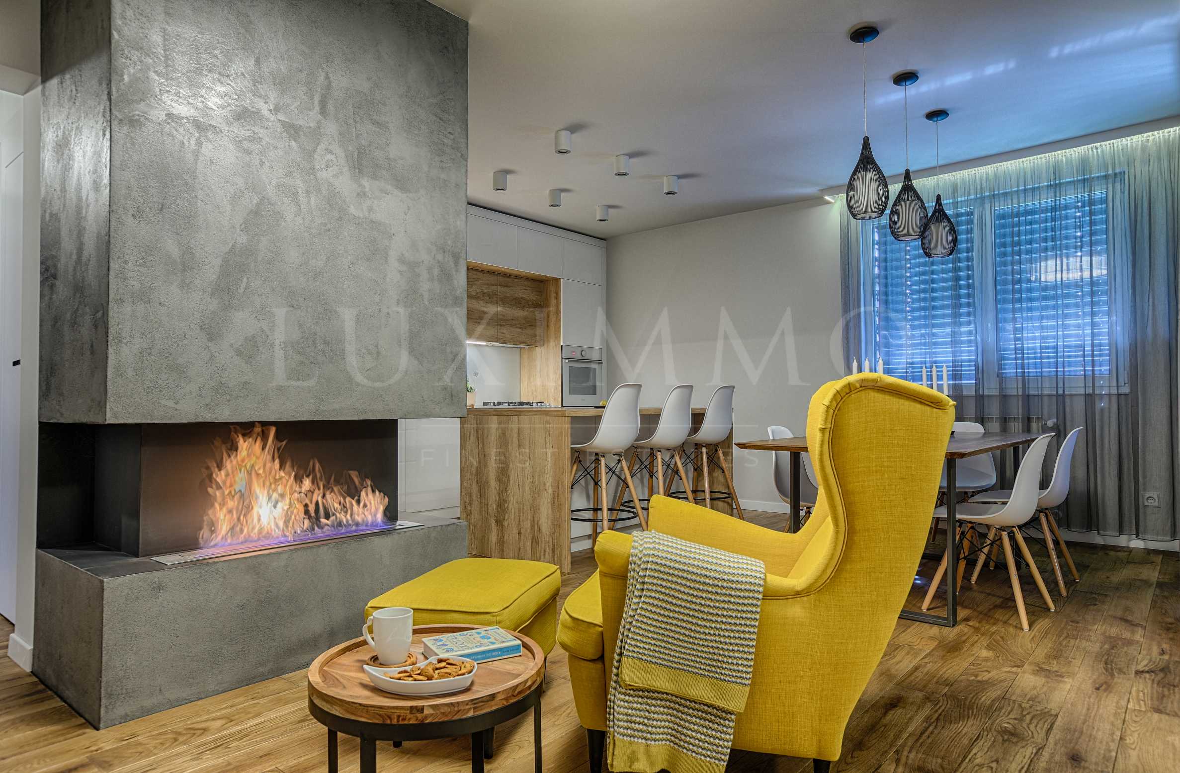 Мебелирано по индивидуален проект и оборудвано с висок клас електроуреди: готварска печка, микровълнова фурна, комбинирани котлони газ и керамика, съдомиялна, пералня със сушилня са заложили на марката "Bosch", а хладилника с фризер е "Siemens", климатиците са "Fujitsu".