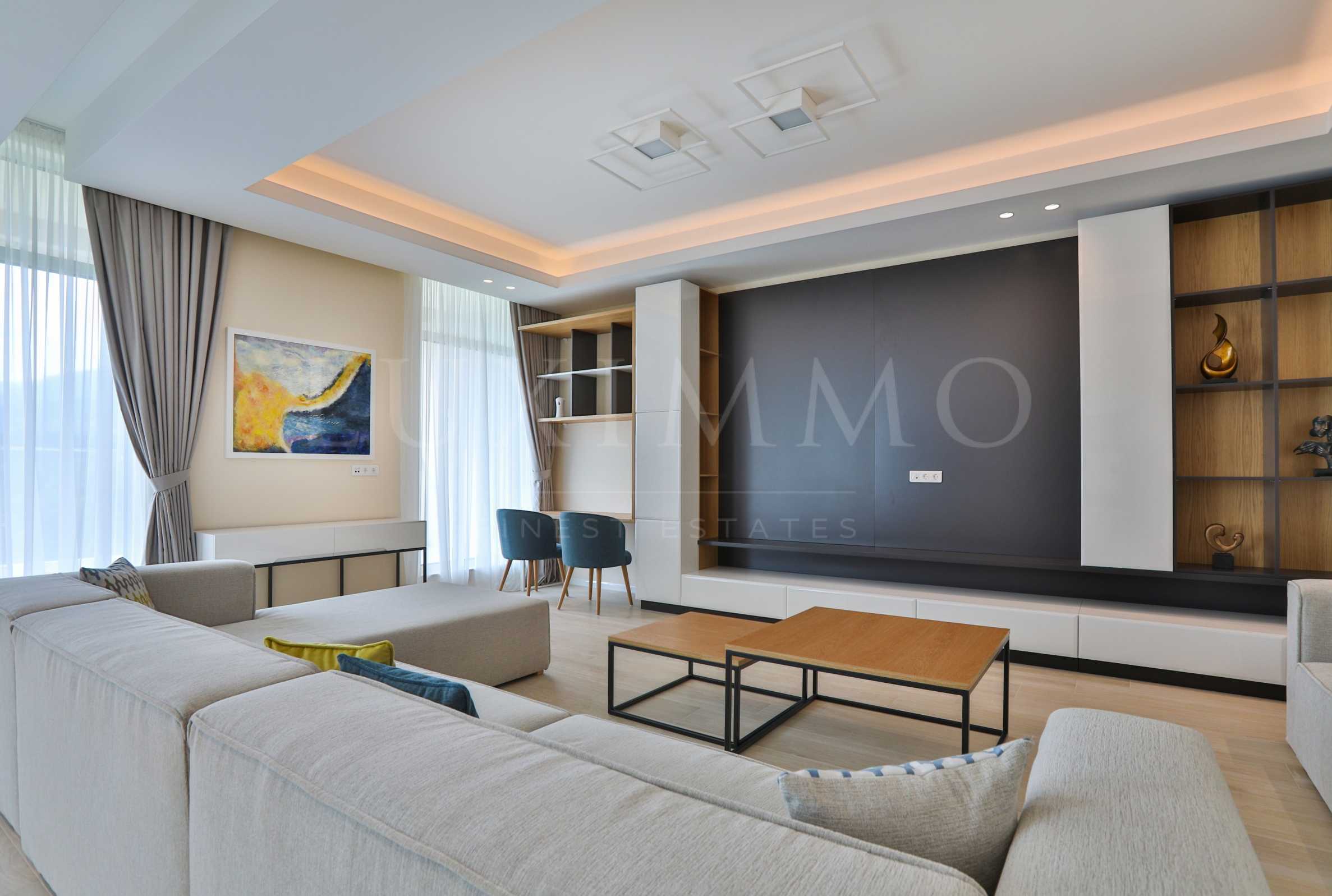 Апартаментът е разположен на трети, предпоследен етаж в сграда с асансьор Otis и отлични общи части с гранит. Изложението е юг/изток/север. Предлага се завършено със следните качествени материали: