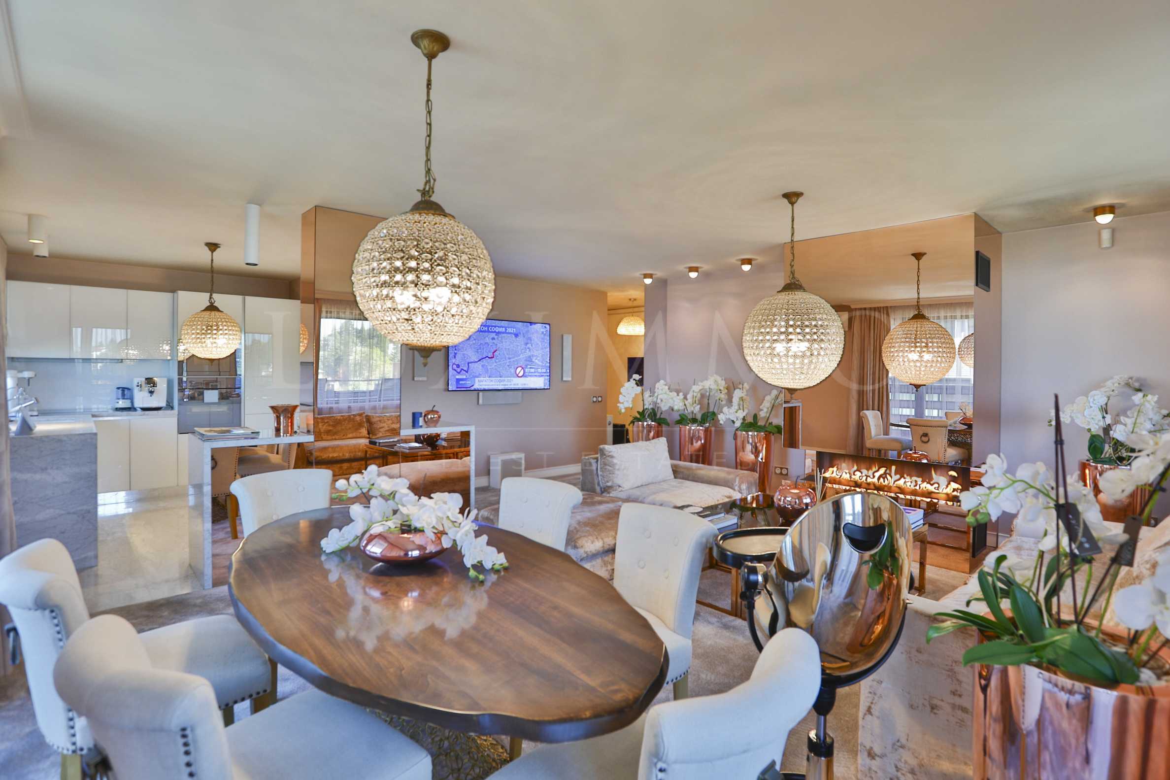 Луксозният апартамент предлага дизайнерски и отличителни интериорни решения. Още с влизането, в коридора ни посреща вграден аквариум с океанска вода. Всекидневната е с приятен интериор, решен с мека мебел Martineli, тапициран с дамаска Alberta - каталожен номер 8191. Трапезната маса е дело на дизайнера Алекс Ковачев, столове са Eichholtz, а завесите - Dedar Hermes. За допълнение към комфорта има инсталирана камина на газ с танцуващ пламък. Нежната бяла кухня е Stosa на Martineli, висококачествено оборудвана с мраморен плот с мелачка за отпадъци, филтрираща система за пречистване на водата, вградена фурна, съдомиялна, котлони и хладилник. Пералня и сушилня Miele са инсталирани в складовото помещение, където също има и винарна Liebher.