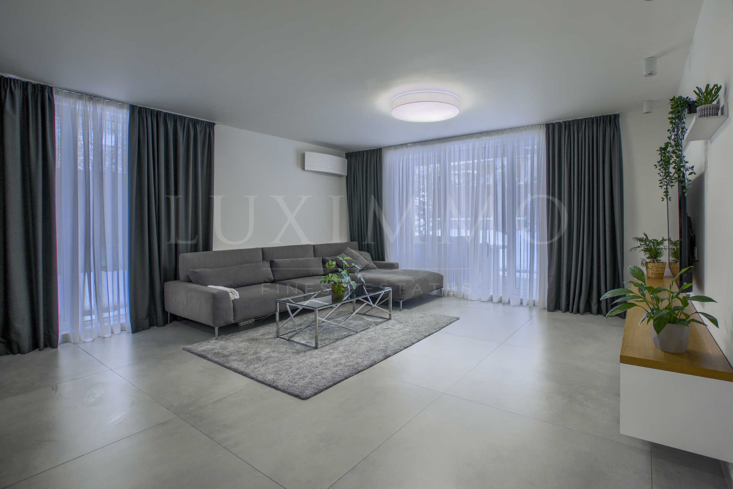 Апартаментът се откроява със стилен интериор изпълнен по проект на дизайнерско студио Acherno със заложени качествени довършителни материали: