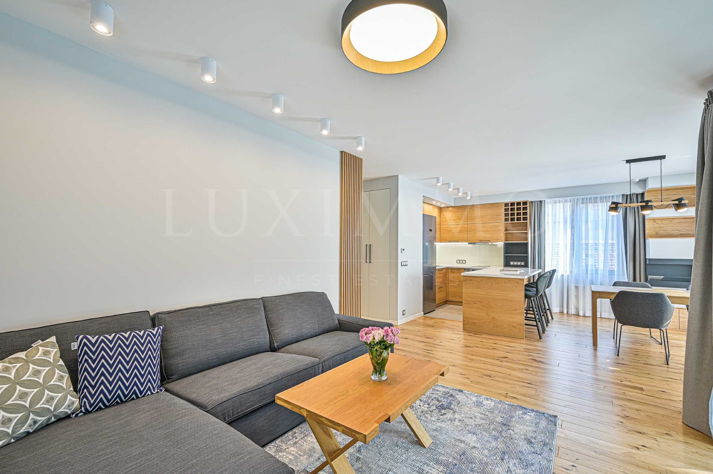 Апартаментът е напълно обзаведен и оборудван с висок клас мебели. Естествени материали, топли цветове, много светлина и топлина ще Ви посрещнат във всяко помещение. Този имот ще Ви предостави пълен комфорт и висок стантарт на живот.