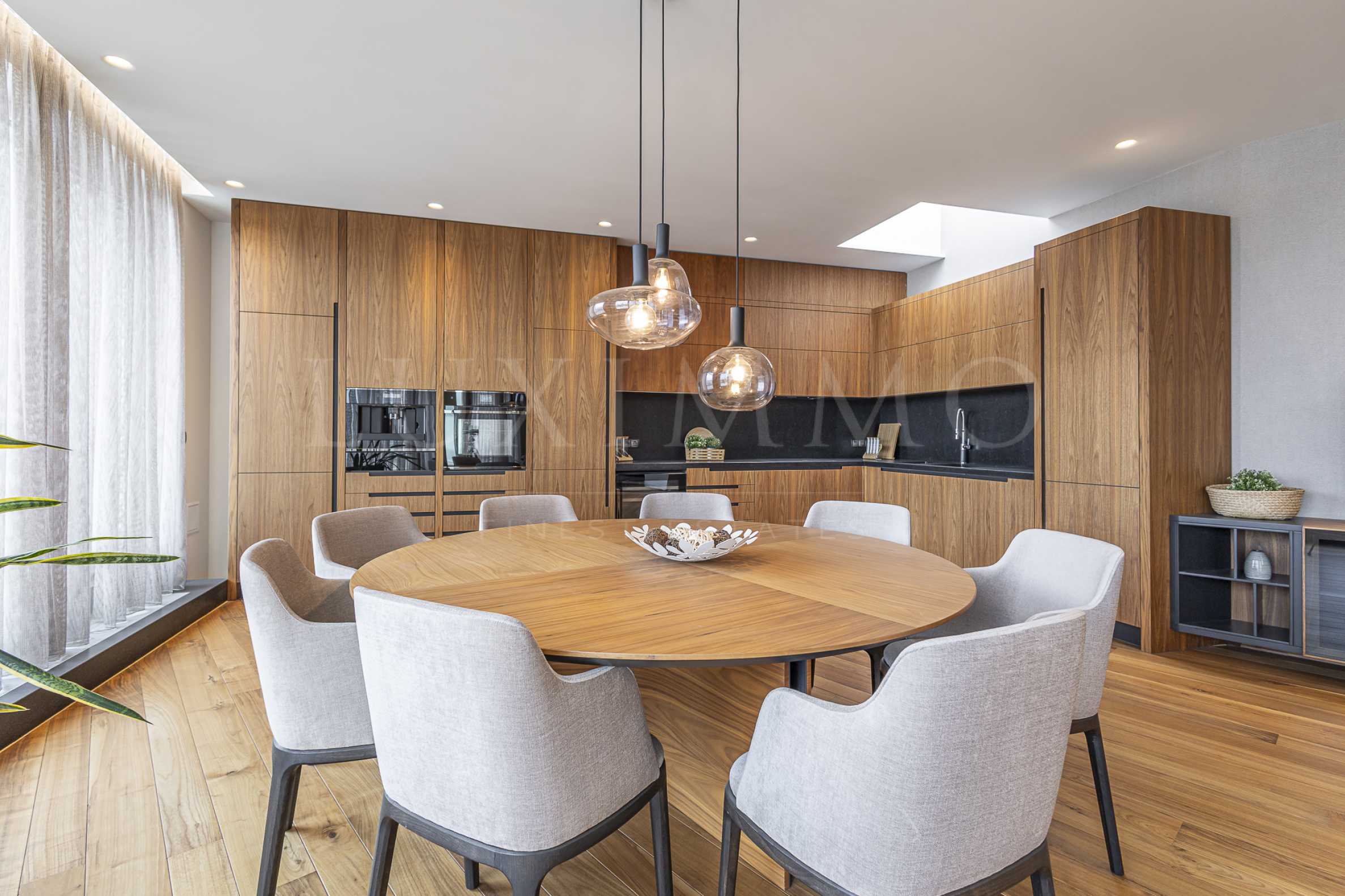 Всекидневната е изключително просторна с елегантен диван, тапициран с лен, от италианския бранд Villevente и кресла Inspirium и City. Трапезната маса е от Twins Design, столове - Inspirium, а кухнята е напълно оборудвана с най-висок клас уреди Küppersbusch. Две от спалните са с легла Golden Night, модел Terence, а третата спалня е с легло модел Frank. Жилището разполага с климатизация с подов вентилаторен конвектор Thermocon, вградено подово отопление и вградена автоматизирана климатична система.