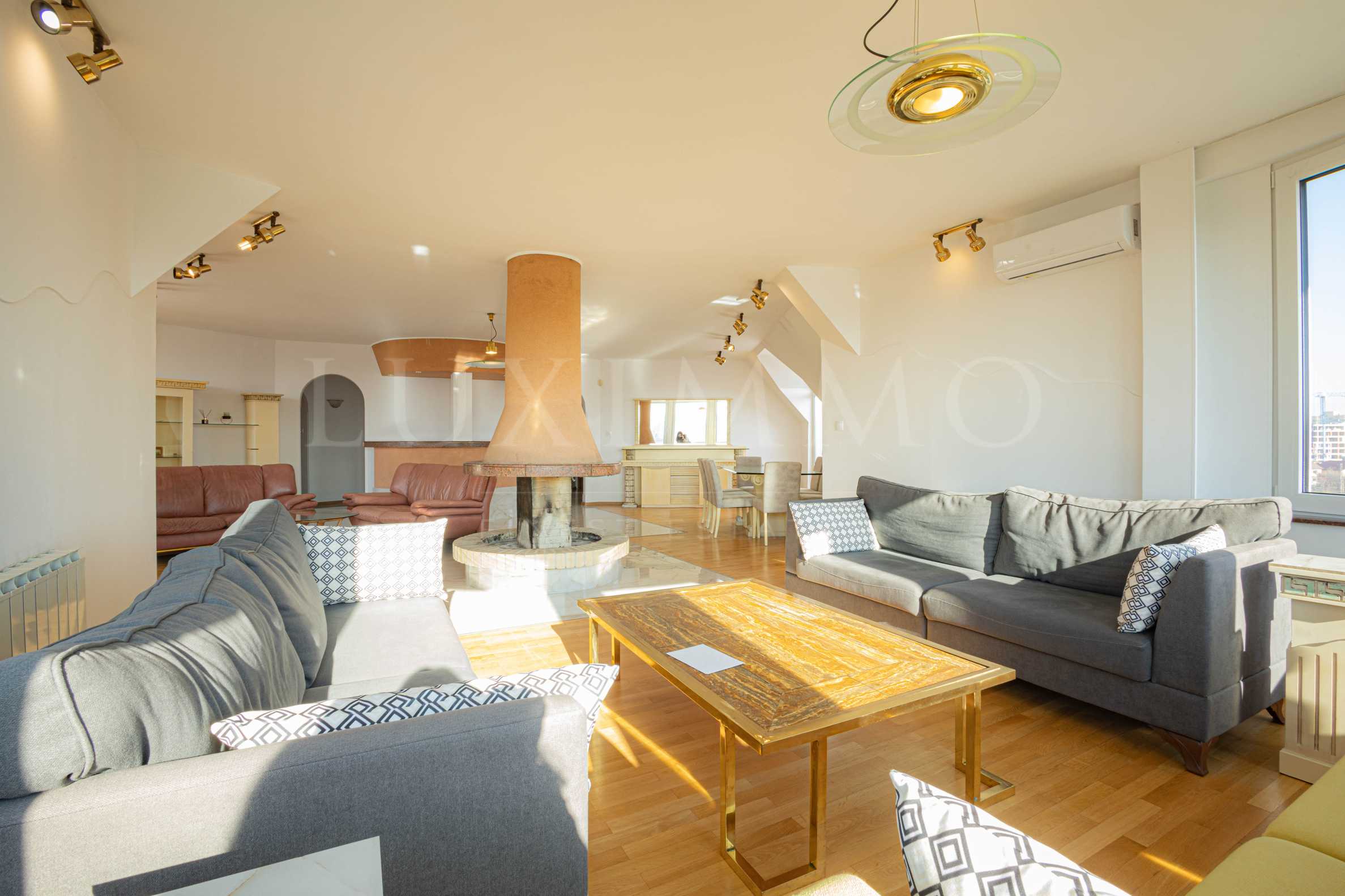 Имотът е ситуиран на 7-и етаж, разположен на 250 кв.м обща площ и се състои от просторен хол, трапезария с площ 70 кв. м. Гледката, която се открива е към планината Витоша и града, която е внушителна и вдъхновяваща. Удобно разположена е и отделната самостоятелна кухня с много естествена светлина и с излаз на тераса, която е обзаведена с трапезарна маса и столове.