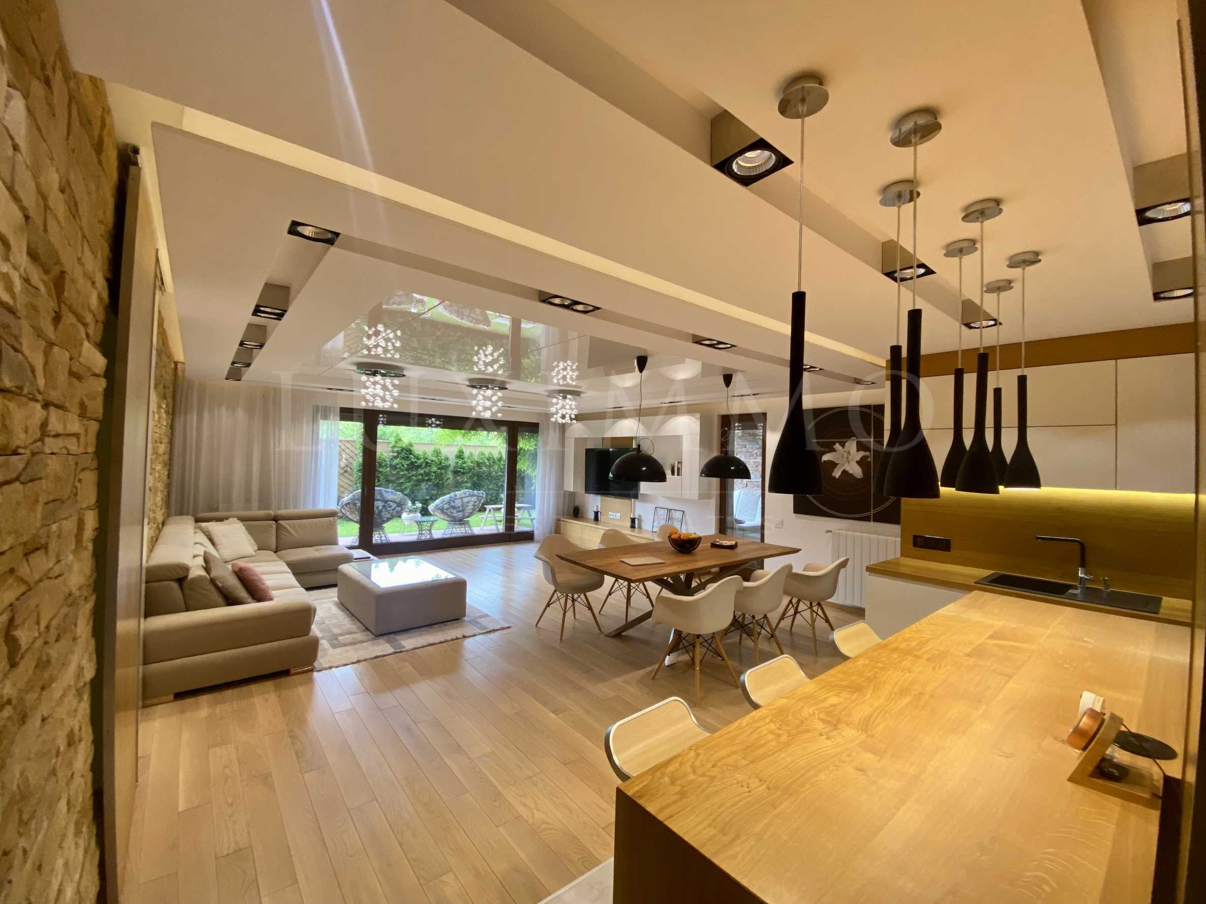 Апартаментът е оформен с модерни мебели по дизайнерски проект, като естественият дъбов паркет добавя уют и топлина към пространството. Допълнителните удобства включват дървена дограма Jelovica, моторизирани ролетни щори, вграден охладител за вино и висок клас пералня и сушилня Miele.