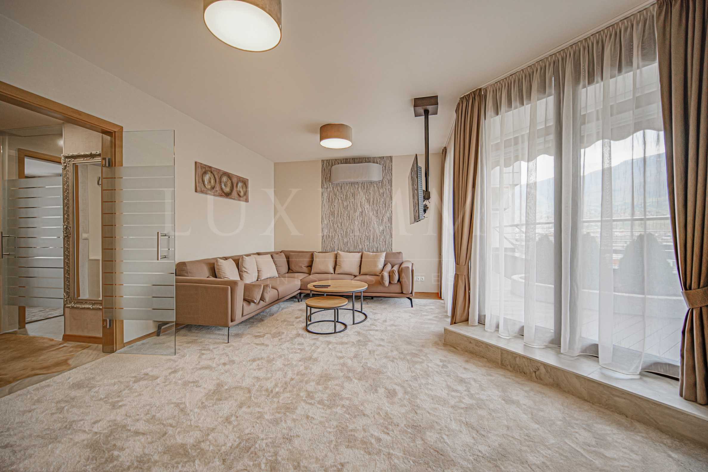 Разпределение: индивидуално входно антре в общите части на сградата, в който спира асансьора, входно антре в апартамента, дневна с кухня, три спални, две бани, две тераси, едната от които с панорамна гледка към Витоша.