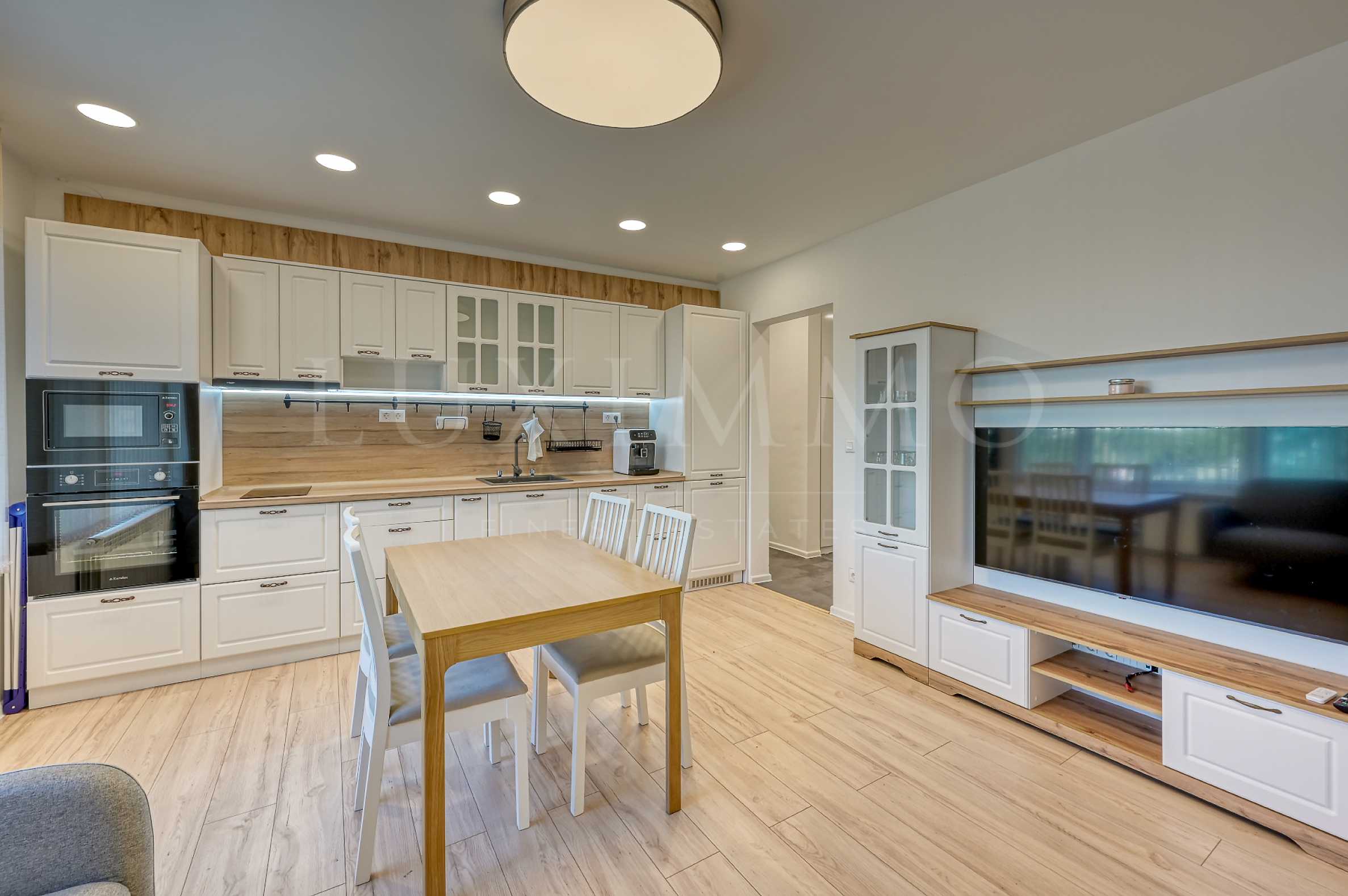 - Просторна всекидневна с трапезария и кухненски бокс оборудван с висок клас електроуреди-съдомиялна, пералня, фурна, котлони, аспиратор, вграден хладилник;