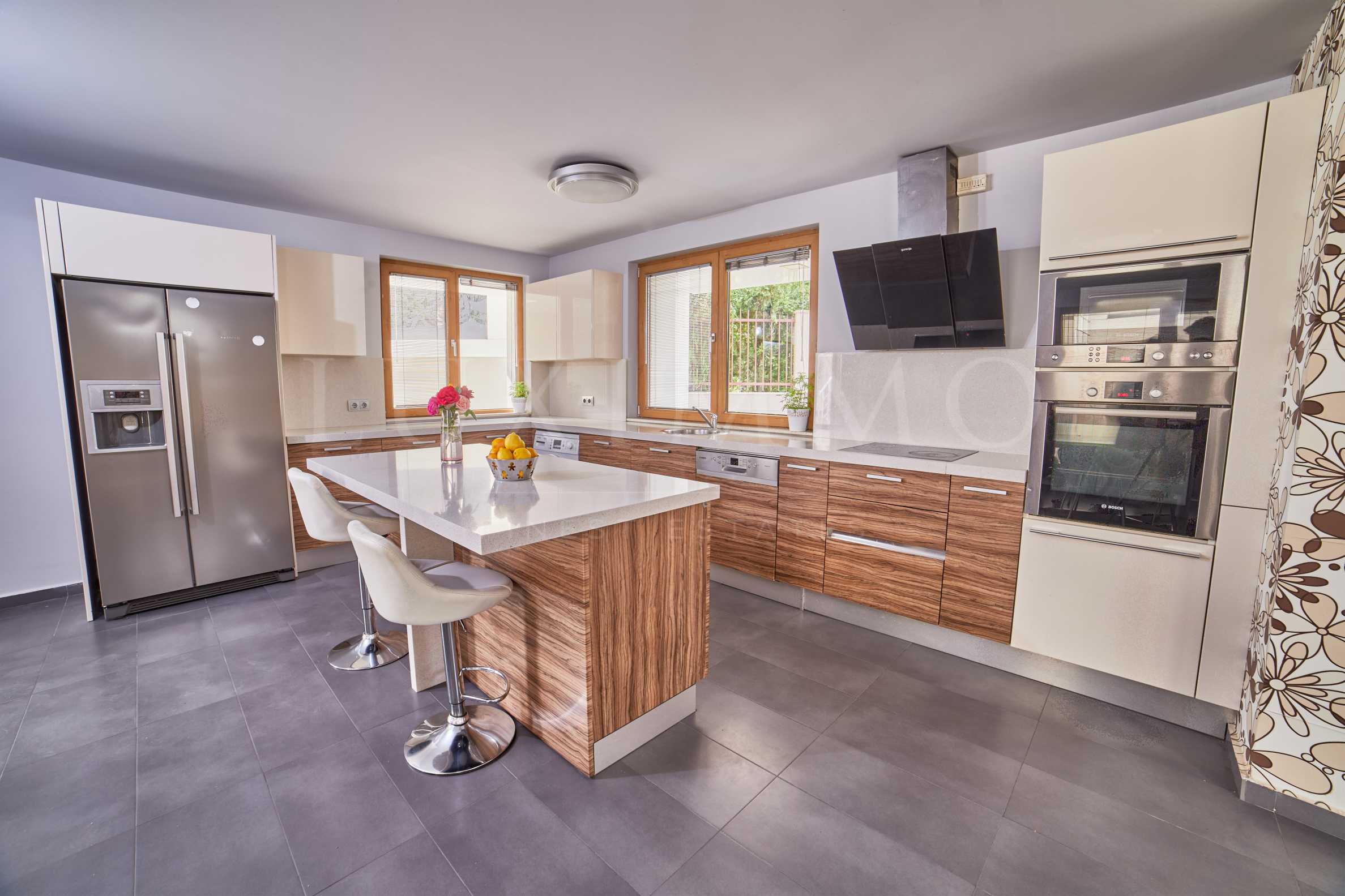 - всекидневна и трапезария с отворена кухня на италиански производител, изцяло оборудвана с уреди на марката "Bosch" и голям остров изграден от технически камък ;
