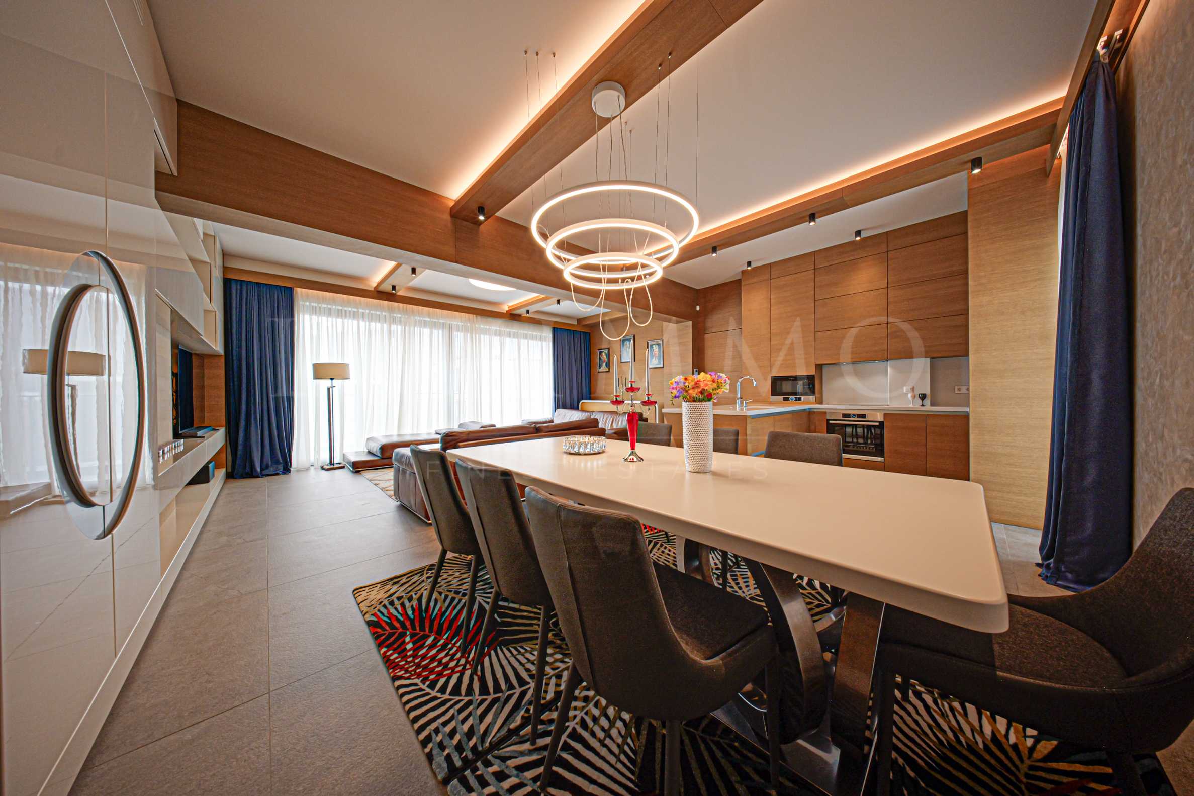 - Всички тавани са с МДФ профили с LED осветление и дизайнерски осветителни тела;