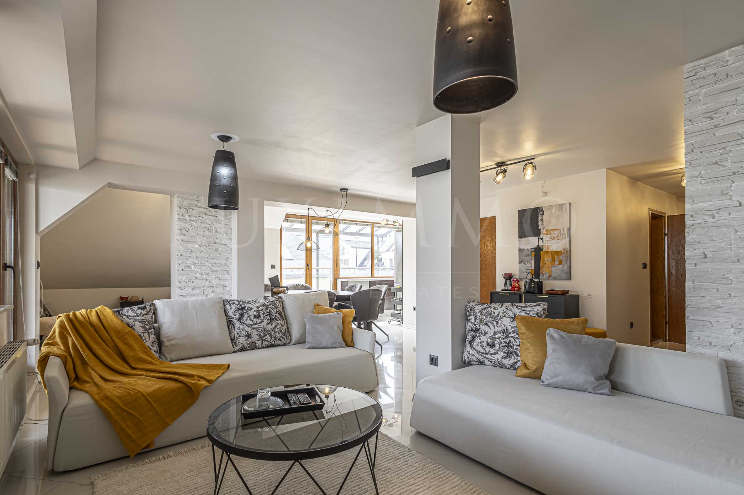 Мезонетът е модерно и стилно мебелиран и готов за нанасяне, в отлично състояние, в имота не е живяно. Намира се на последни 7-и и 8-и етажи в жилищна сграда и има гледка към Витоша и града. Изложението е благоприятно - юг/изток/запад.