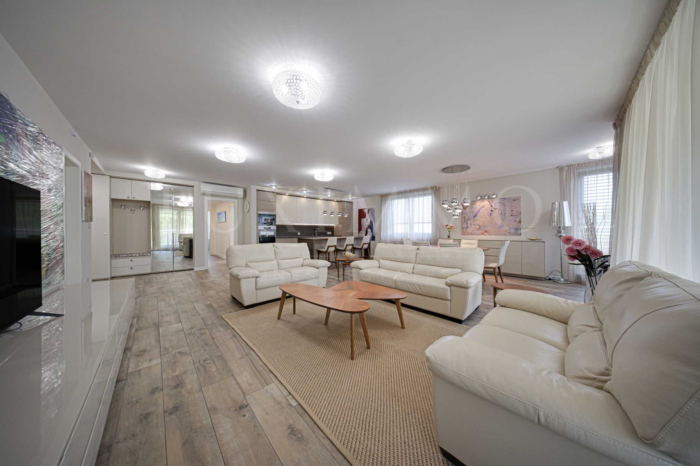 Жилището се отличава с усещане за простор, стилен дизайн и внимателно подбрани детайли. Пространството обединява уютен хол с кухненски бокс и трапезария, три спални, три бани, мокро помещение и гардеробна. Интериорът е решен в светли тонове, с артистични акценти и естествена светлина, проникваща през големи прозорци.