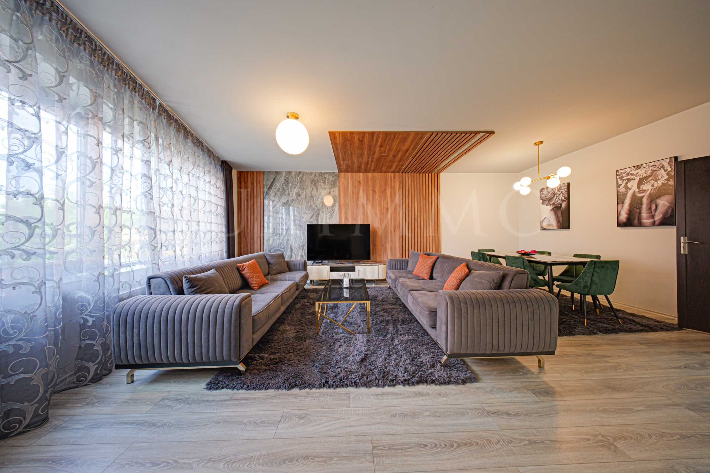 Апартаментът е завършен с материали от висок клас, включително италиански фаянс, дизайнерско обзавеждане и вградени електроуреди. Обзавеждането е подбрано с внимание към детайла, интериорът е модерен и стилен.