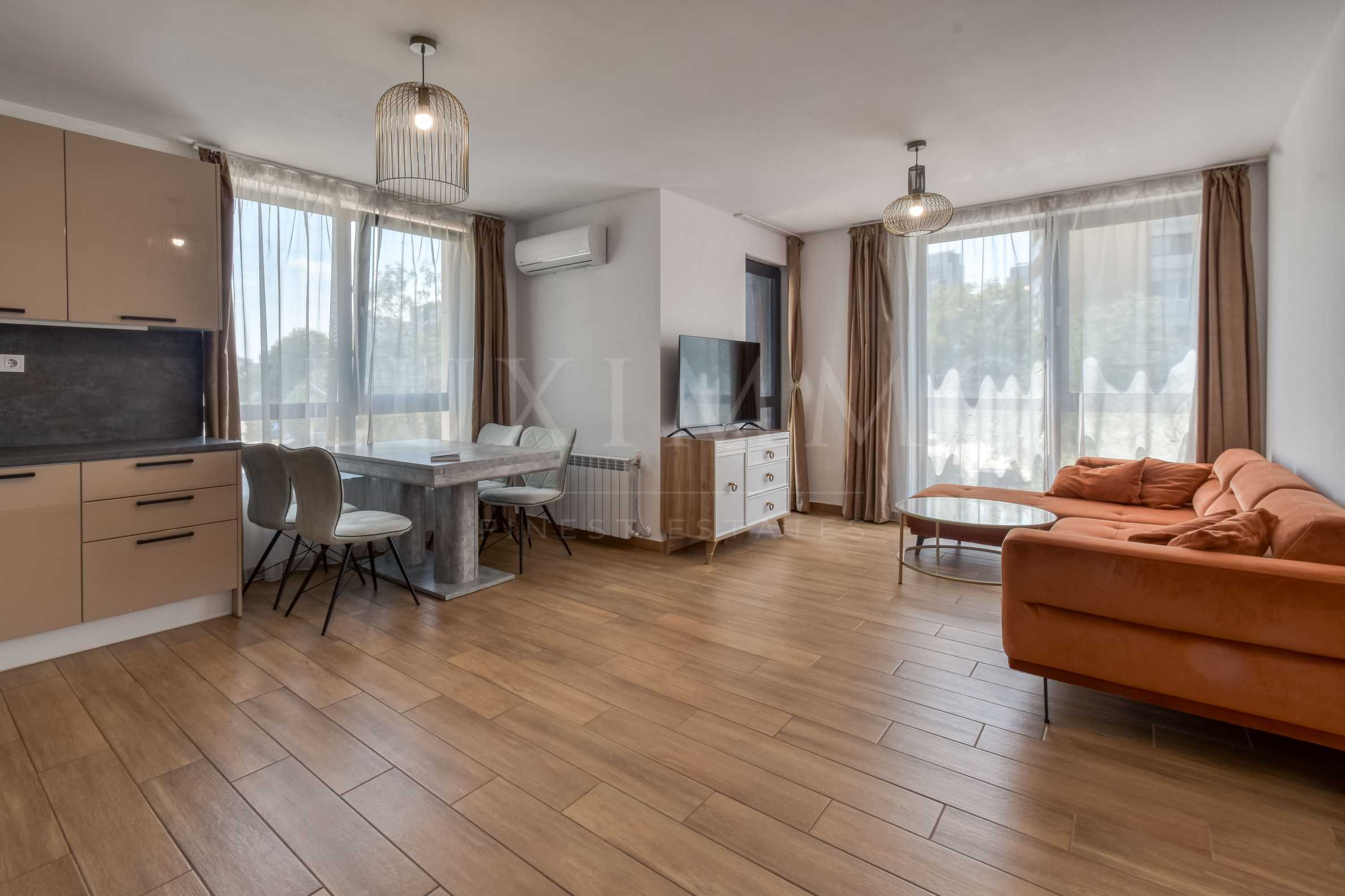 Жилището е изключително просторно, светло, изпълнено с внимание към детайла. Подът е звукоизолиран. Кухнята е напълно оборудвана - вградена фурна, вградена съдомиялна и котлони. Имотът разполага с пералня и сушилня. Изцяло обзаведен и готов за нанасяне.