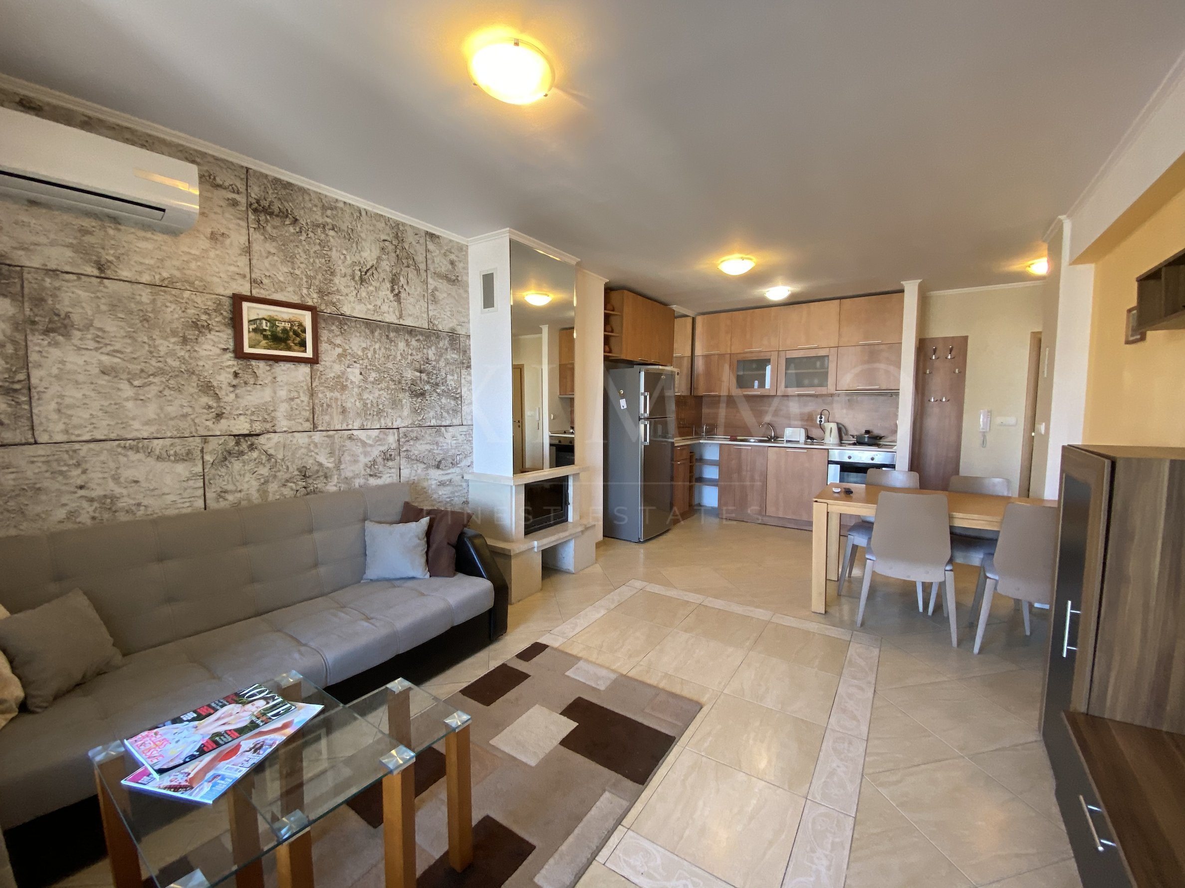 Отоплението е на ток, чрез ел. радиатори. Има поставена и камина.