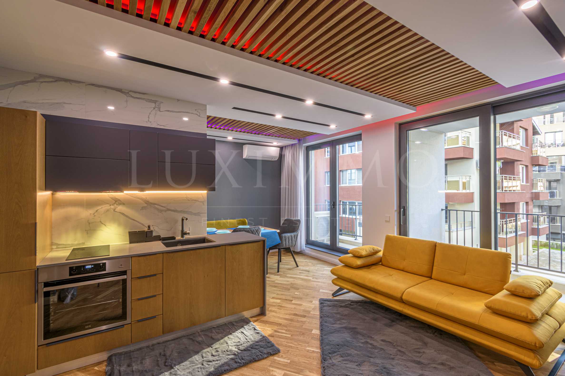 Жилището се състои от дневна с кухненски бокс, спалня, баня и две тераси. Оборудвани са с нови, модерни електроуреди: изключително тиха пералня със сушилня с инверторен мотор AEG, фурна AEG, плот AEG, съдомиялна AEG, кафемашина, аспиратор Faber, прахосмукачка-робот Xiaomi, хладилник Gorenje, два телевизора Sony с гласови команди в дневната и спалнята, таблет. Изградена е умна система за управление на осветлението и завесите, вентилатора в ванята която ще улесни ежедневието Ви и ще ви предложи допълнително удобство. Управлението става чрез таблет, телефон или чрез Кубче контролер Aqara Magic Cube.
