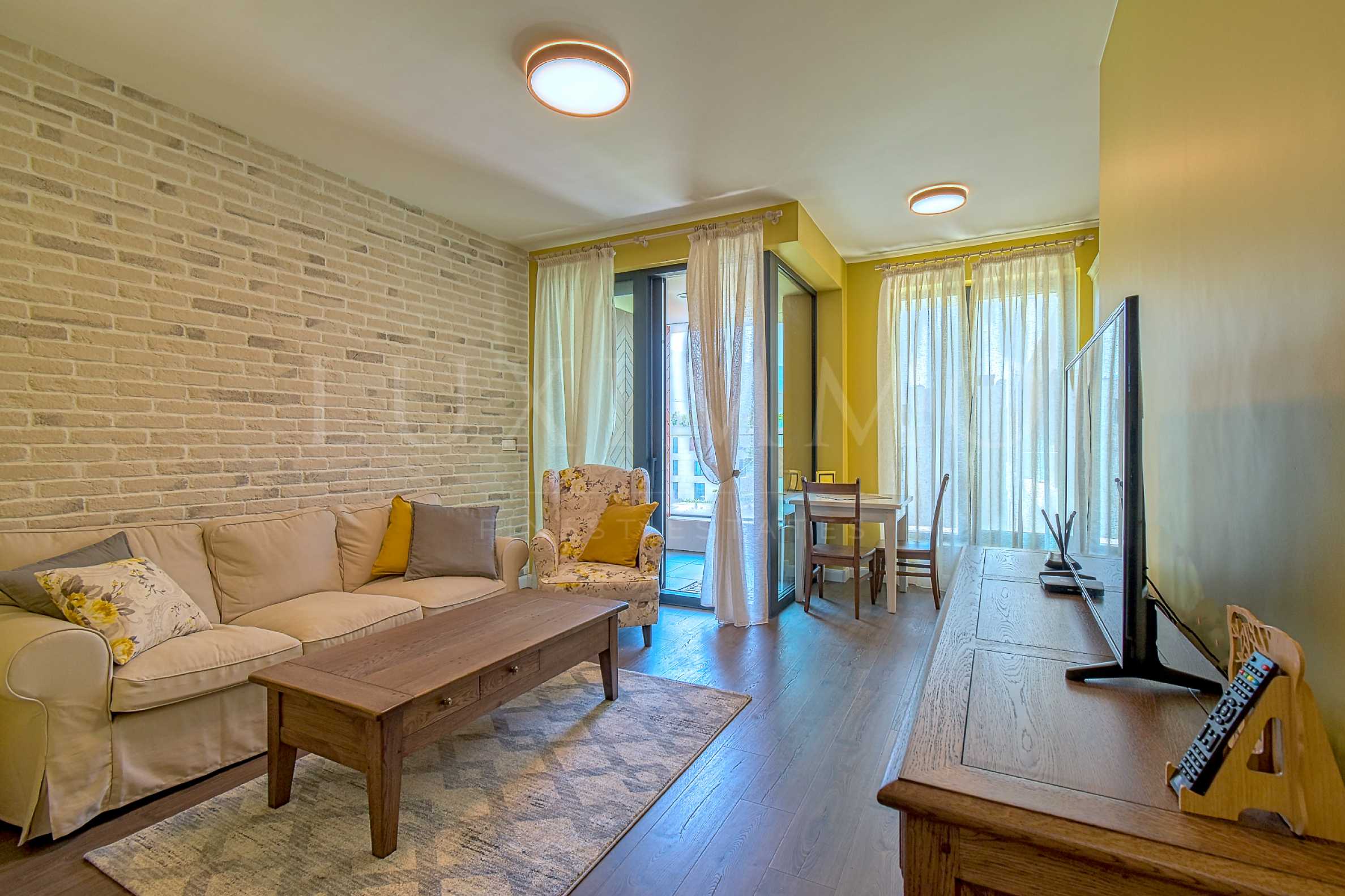Апартаментътсе състои от дневна с обособена кухня, трапезария и кът с мека мебел, просторна спалня с голям дрешник и баня, както и с тераса към дневната, от която се открива великолепна панорамна гледка към Витоша. Жилището се предлага напълно обзаведено с мебели от най-висок клас от масивна дървесина (дъб) и оборудвано с вградени електроуреди и санитария от водещи световни марки. Изградено е подово отопление и монтиран самостоятелен газов котел Bosch. Системата е окомплектована с регулаторите NEA SMART 2.0, които позволяват дистанционен контрол (за всяка стая) на подовото отопление през смартфон. Масивна входна врата, блиндирана с МДФ дървесен декор с механично и електронно управление, 3D регулируеми скрити панти, автоматичен праг, видео шпионка с вграден touch дисплей, с възможност за дистанционно управление през мобилен телефон.