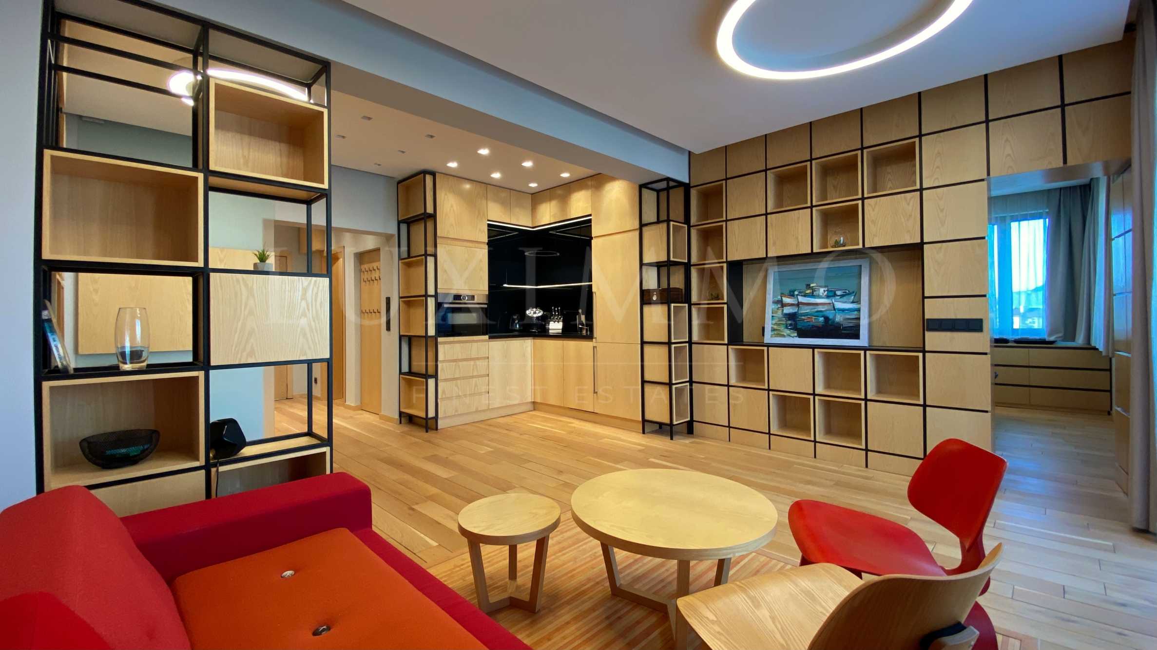 Дизайнът на апартамента е дело на известен столичен архитект, а в направата му са използвани само естествени материали като дъб, гранит и мрамор.