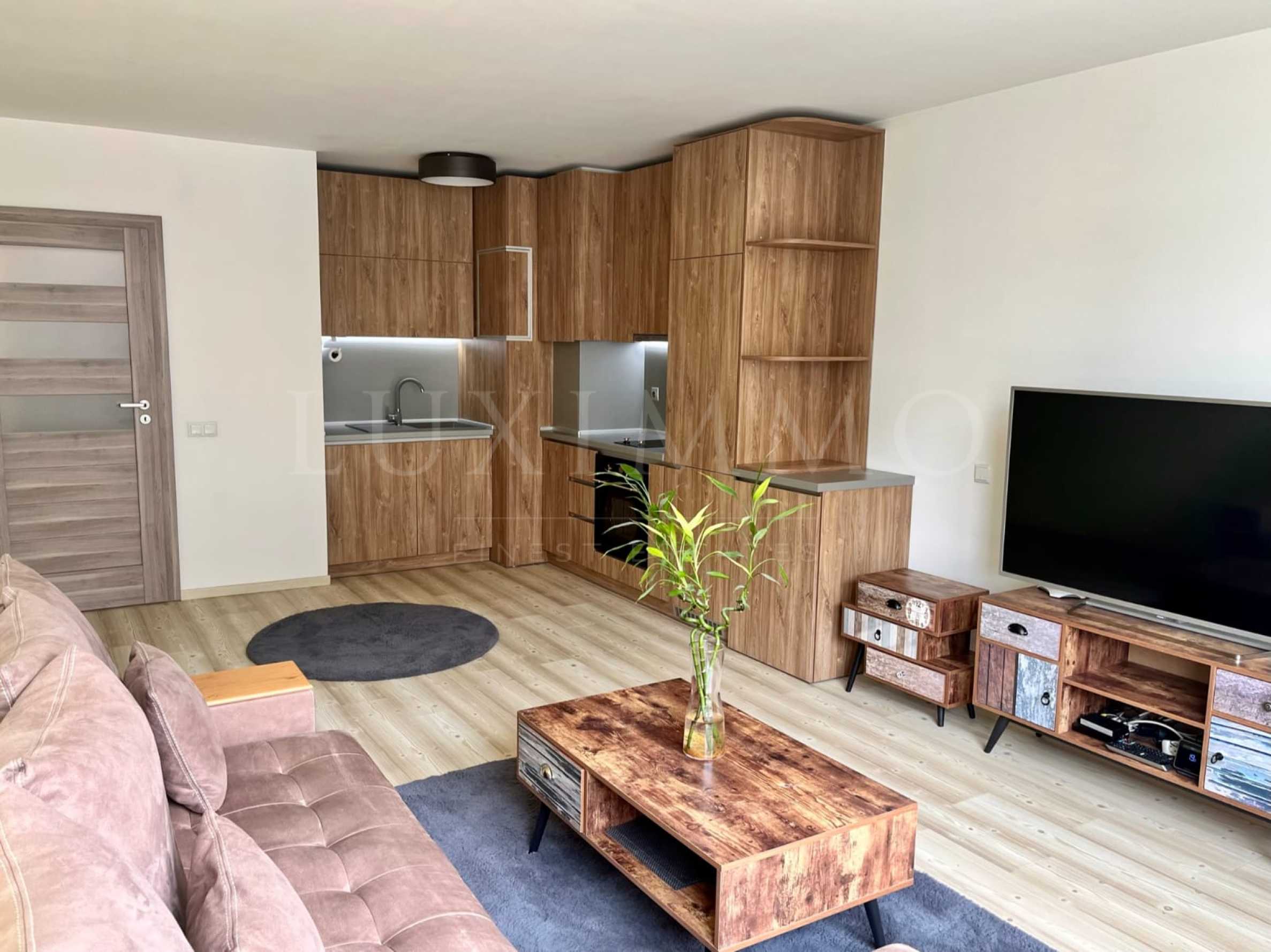 Апартаментът е вътрешен и разположен на етаж 2-и (над партер), с изложение югозапад и гледка към Витоша. Чистата жилищна площ е 65 кв.м, с функционално разпределени помещения и обзавеждане с дизайнерски мебели.