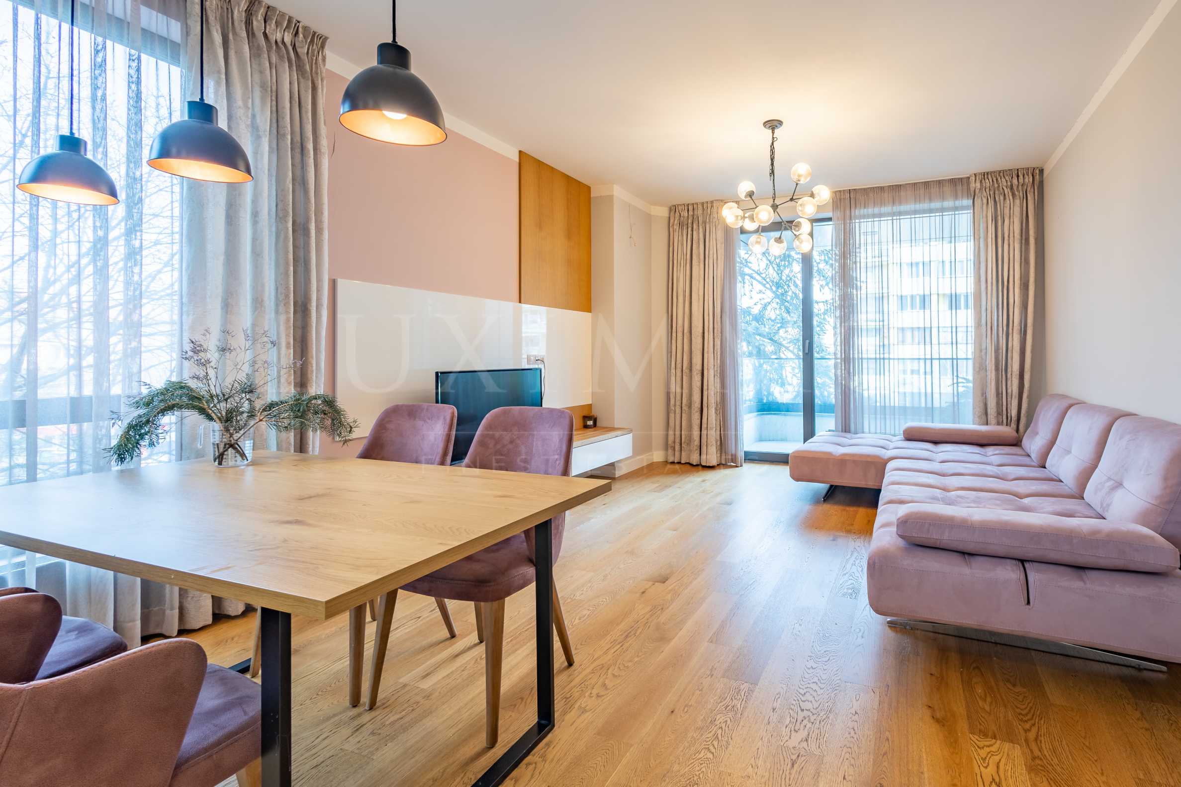 Жилището е ситуирано на 2-ри от общо 8 и разполага с 80 кв.м обща площ. Помещенията са просторни и светли, а интериорът е изпълнен с качествени и модерни мебели и техника. Дограмата е Reynaers - висококачествена, алуминиева, с троен стъклопакет.
