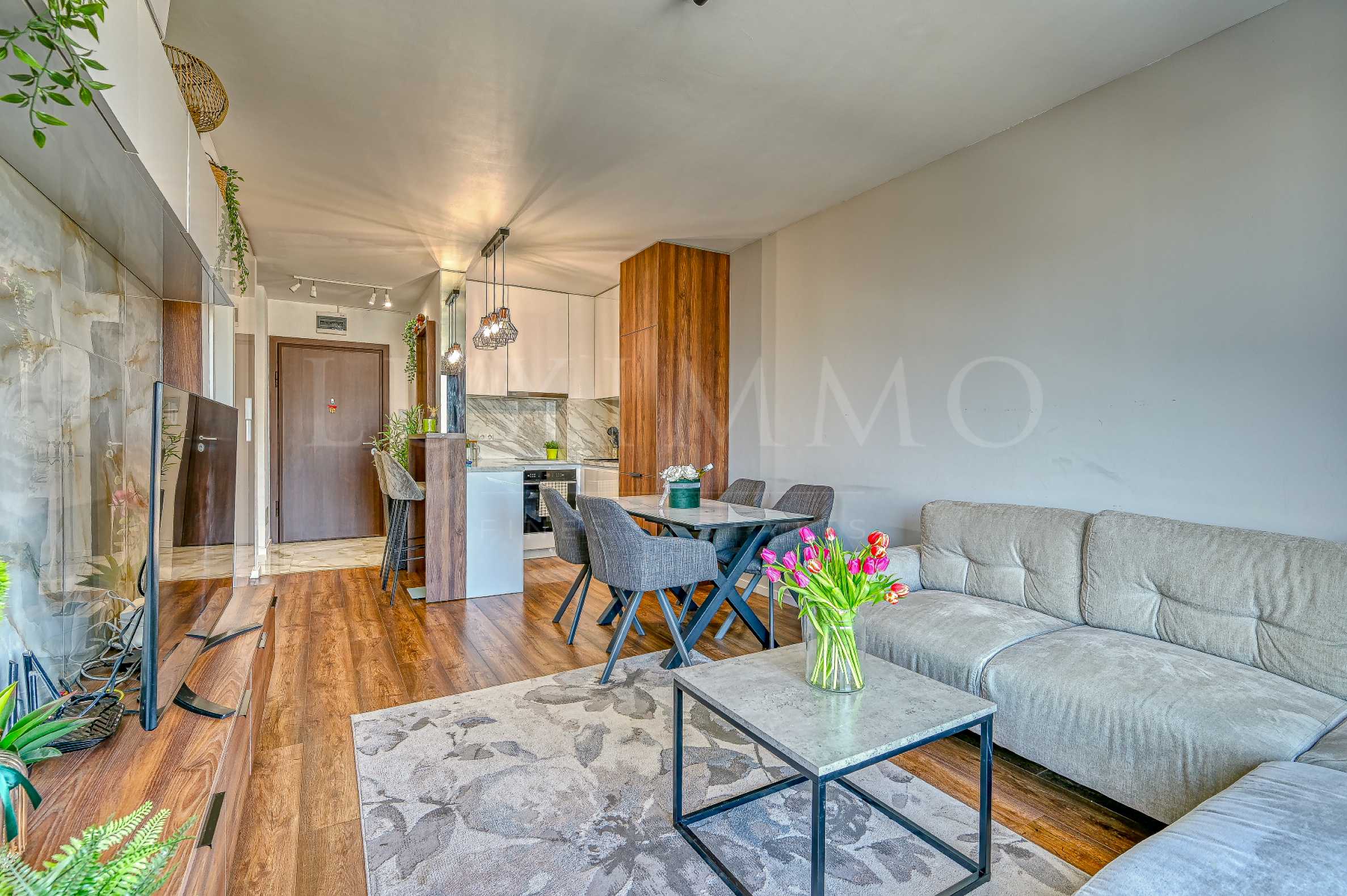 Създаден с внимание към всеки детайл, апартаментът представлява краен резултат от индивидуален дизайнерски проект. Разпределението на пространството обхваща функционално входно антре, модерна баня с тоалетна, уютен хол с интегрирана кухня, привлекателна спалня с тераса и удобно мокро помещение, обособено като гардеробна. Има опция за гараж, който може да бъде нает под наем за 250лв. месечно.